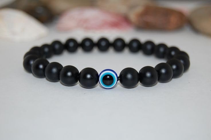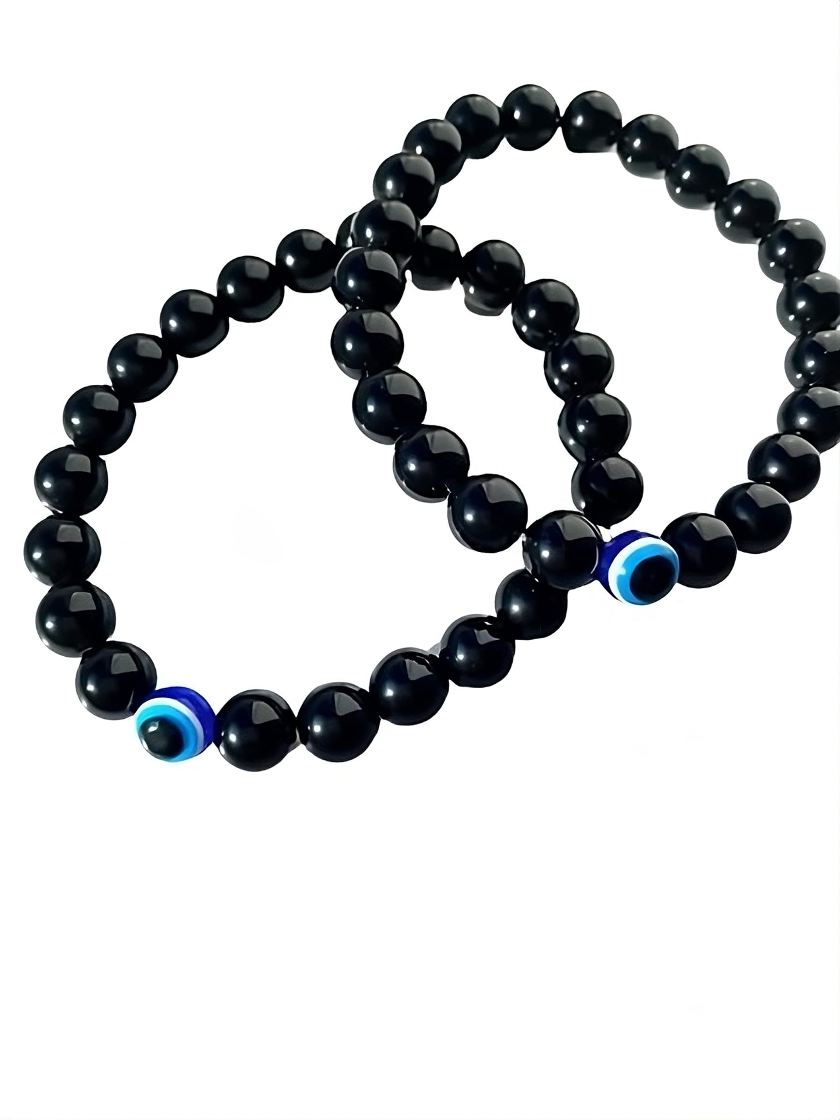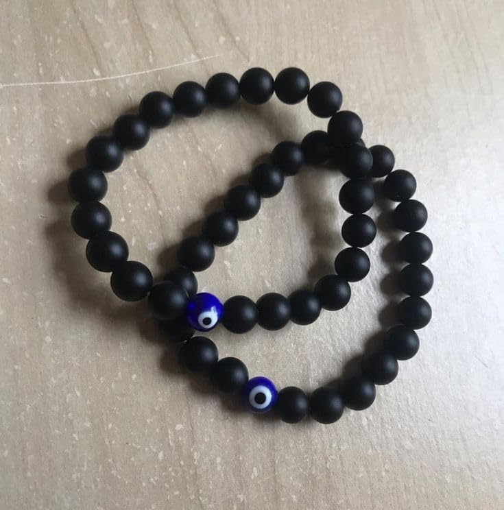 Powerful Protection: Embrace the mystique of the Black Glass Onyx Evil Eye Nazar Couple-Combo Matching Bracelet Set designed to shield you from negativity and attract positive energies. µ Evil Eye Nazar Charms: Adorned with captivating blue Evil Eye Nazar charms these bracelets serve as a symbol of protection keeping watch over you and your loved one as you navigate through life's journeys. Sleek Black Glass Onyx Beads: The bracelets feature smooth and lustrous black glass onyx beads adding an element of sophistication to your style while promoting strength and resilience. Couple-Combo Design: Celebrate your connection with matching bracelets for both partners reinforcing the bond you share. The set embodies unity and protection making it a thoughtful gift for anniversaries birthdays or special occasions. Versatile and Stylish: The stretchable design ensures a comfortable and secure fit for both him and her allowing you to effortlessly incorporate these bracelets into your daily wardrobe. Perfect for casual outings date nights or special events. Balanced Harmony: Find harmony in the balance of style and symbolism with this unique couple-combo bracelet set blending the beauty of black glass onyx with the protective power of the Evil Eye Nazar. Wear the Black Glass Onyx Evil Eye Nazar Couple-Combo Matching Bracelet Set and let the powerful combination of style and symbolism accompany you on your journey protecting your connection and inviting positivity into your lives.