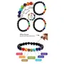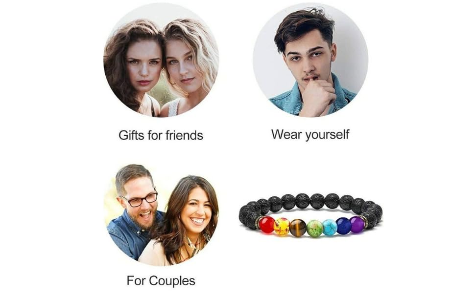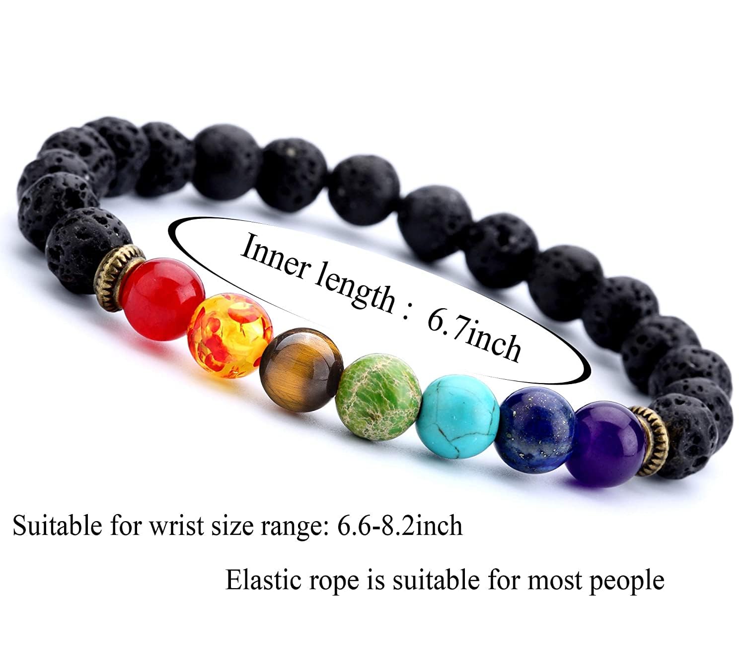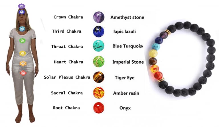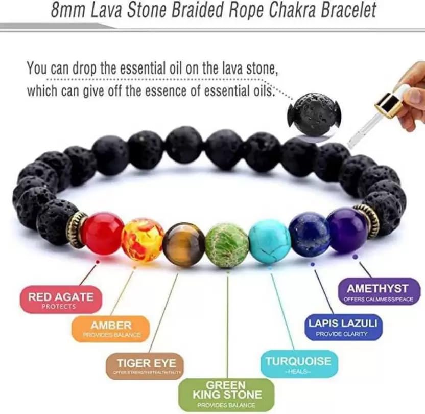 Sukhad The seven chakra bracelet consists of 7 gemstones with unique and valuable healing properties. These are natural stones so their color shape and sizes vary and sometimes there are holes in it. Also there are grains inside the stones which look like cracks but these are natural. Root Chakra (Red): Garnet - Known to ground and energize the base chakra fostering feelings of security stability and connection to the earth. Sacral Chakra (Orange): Carnelian - Promotes creativity passion and healthy expression of sexuality. Solar Plexus Chakra (Yellow): Citrine - Inspires confidence self-esteem and personal power. Heart Chakra (Green): Peridot - Encourages love compassion and forgiveness. Throat Chakra (Light Blue): Aquamarine - Supports clear communication self-expression and truth. Third Eye Chakra (Indigo): Amethyst - Enhances intuition wisdom and spiritual connection. Crown Chakra (Violet): Clear Quartz - Amplifies clarity focus and spiritual awareness. Stretchable Bracelet | Diameter : 2.5 Inch.| Stone Size 8 mm Beads | Shape - Round.(Seven Chakra Lava Bracelet)