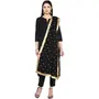 Give a touch of charismatic splendour to your ethnic silhouette with this gorgeous dupatta in classy black hue. Adorned with golden patti edges and golden buttis to underline pure feminine sophistication this beautiful creation can be flaunted at the next cultural meet with a contrast kurti embroidered palazzos and classy platforms.