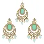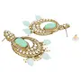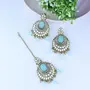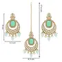 A beautiful set of jewelry that will add elegance and grace to any traditional attire.These chandbali earrings are gold plated and adorned with shimmering kundan stones that sparkle in the light. The earrings feature traditional pearl hangings that add a touch of sophistication to the design. Accompanying the earrings is a matching maang tikka which is studded with kundan stones and pearls. The maang tikka beautifully complements the earrings and adds a touch of glamour to any hairstyle.This jewelry set is perfect for weddings festivals and other traditional occasions. It also makes a great gift for any special woman or girl in your life.