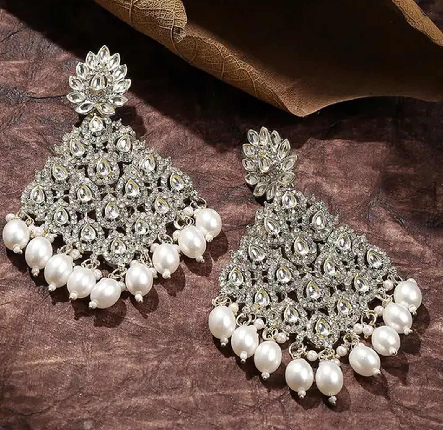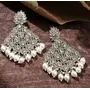 Make a stunning statement with these exquisite emerald chandelier earrings, meticulously handcrafted with shimmering stones and intricate metalwork. These show-stopping earrings feature a beautiful lattice design adorned with brilliant emerald white teardrop gemstones cascading elegantly from a dazzling ornate top.Perfect for brides, bridesmaids, and guests alike, these earrings beautifully complement lehengas, sarees, anarkalis, and even contemporary fusion wear. The versatile white color pairs wonderfully with traditional outfits in green, gold, cream, red, and many other hues.Each earring showcases: Sparkling silver-toned metalwork with delicate filigree details Multiple teardrop white gemstones arranged in a chandelier pattern Lightweight yet statement-making design for comfortable all-day wear Secure fastening to keep these precious pieces in placeElevate your special occasion look with these heritage-inspired earrings, whether you're attending a wedding, festival celebration, gala dinner, or cultural ceremony. These timeless pieces also make thoughtful gifts for loved ones celebrating milestone moments.Add these handcrafted ethnic earrings to your collection today and experience the perfect blend of traditional craftsmanship and contemporary elegance that will turn heads wherever you go!