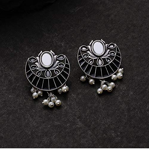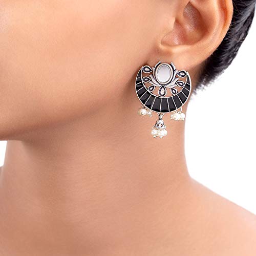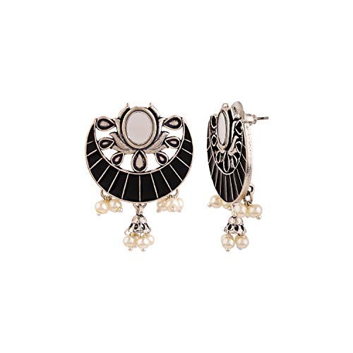 Faux pearls embellished earrings fashioned out of brass. Wear the oxidized silver plated pair with an ethnic kurta. This piece of jewelry comes with the Voylla assurance of quality and durability. Caring for your fashion jewelry: We at Voylla take care of every piece of jewelry so that you don't spend hours caring for them. But do remember fashion jewelry lasts longer when kept dry and free of chemicals. Follow this simple rule: Your jewelry should be the last thing you put on and the first thing you take off.