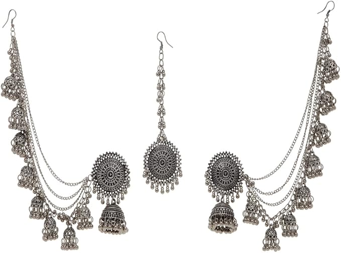 Shining Diva Fashion Latest Stylish Oxidised Maang Tikka Bahubali Jhumka Earrings for Women and Girls (12395er), One, Metal, No Gemstone, One, Metal, No Gemstone