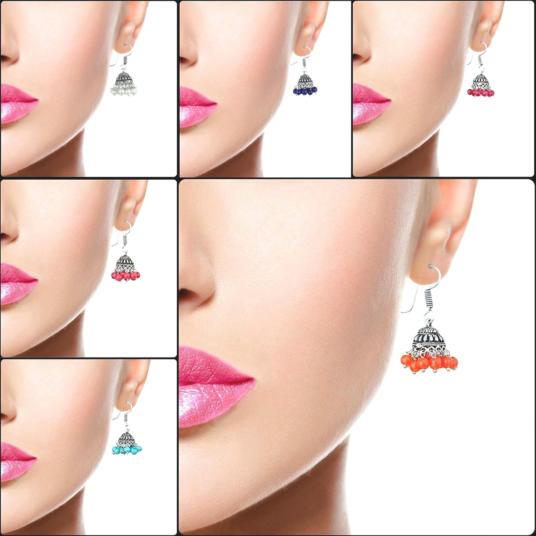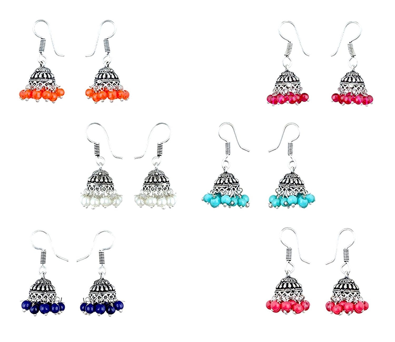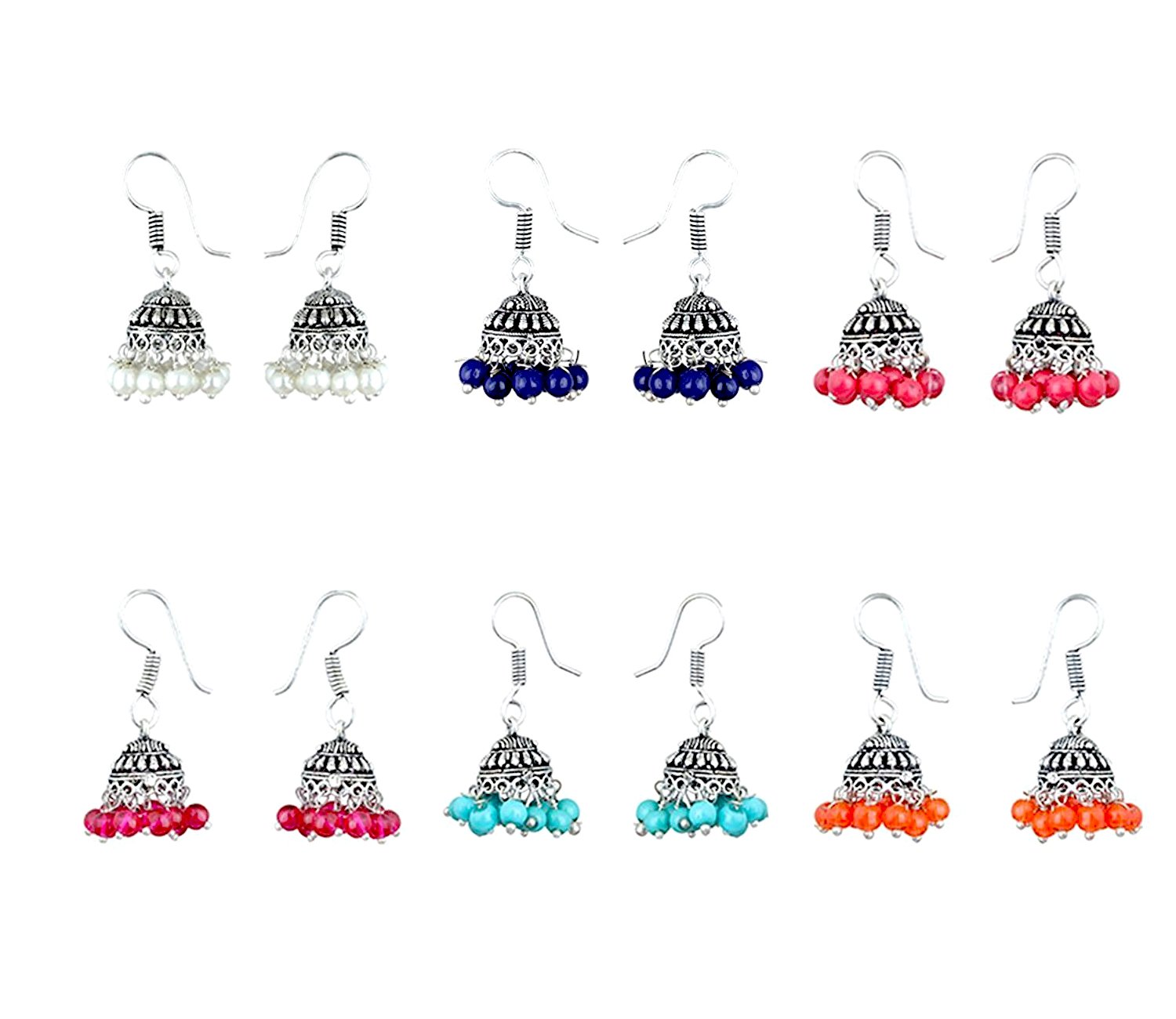SPECIFICATIONS-: Package Content-: 6 Earrings Pair Dimension: Earrings- Length- 4 (Centimeters) Width- 1.30 (Centimeters) Gross Weight-: 5 Grams Material-: Oxidised Silver Plated Brass Color:- Silver (Oxidised) Earring Style-: Jhumki Back Finding-: French Wire / Fish Hook Care Instruction : Avoid Heat & Chemicals Like Perfume Deodorants Alcohol Etc. | Clean With Dry Cotton Cloth | Pack In An Air Tight Container After Use. SILVER FILIGREE CRAFT - CHANDI TARKASHI Six Beautiful Jhumkis Combination For Party Wear Casual Office wear College wear wedding Functions Festivals perfect for any occasion & weather Winter Autumn Spring Summer. Mutiple color options can be mix and match with any dresses and attire. These Combo Earrings Designer And Trendy Earrings are perfect to showcase your colorful and joyous lifestyle. SILVER FILIGREE CRAFT - CHANDI TARKASHI Jhumki Earrings The jhumki earrings are available in a set of 6 pairs having different colours. Carved from silver plated metal these Jhumki earrings are studded with stones which gives it a special luster. The stones are beautifully placed around the Jhumki and also on the tip of the earrings. These pair of earrings are suitable for women as well as girls and can be worn to parties or festive occasions. Style Tip Wear these Jhumka Earrings with ethnic wear such as a Saree Salwar Suit or a Lehenga Choli for a classic ethnic look. You can also match them with fashion slippers or ethnic footwear of your choice. Care Instructions Keep the jewelry away from direct heat water perfumes deodorants and other strong chemicals as they may react with the metal or plating. Store the jewelry when not in use in a storage box or a cloth pouch to retain its shine.