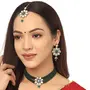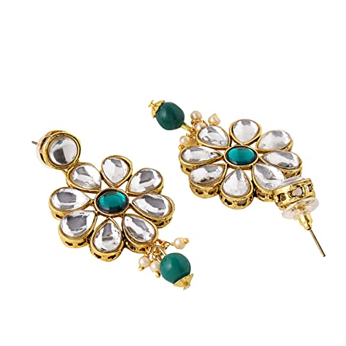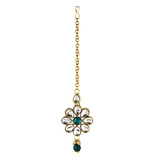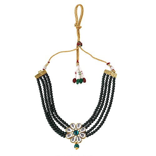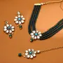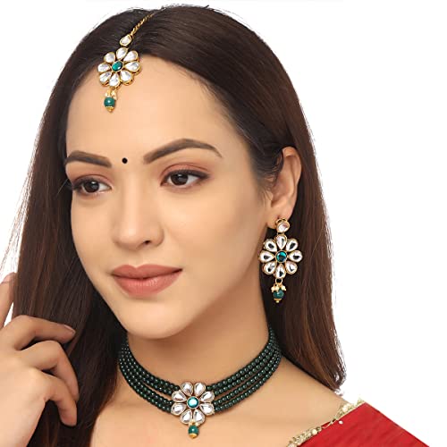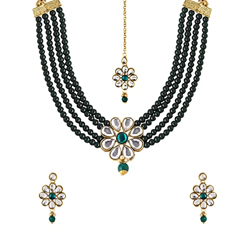 Yellow Chimes Jewellery Set Green Beads Floral Charm Kundan Studded Beads Drop Neckalce Set with Earrings & Maangtikka for Women and Girls Free Metal No Gemstone