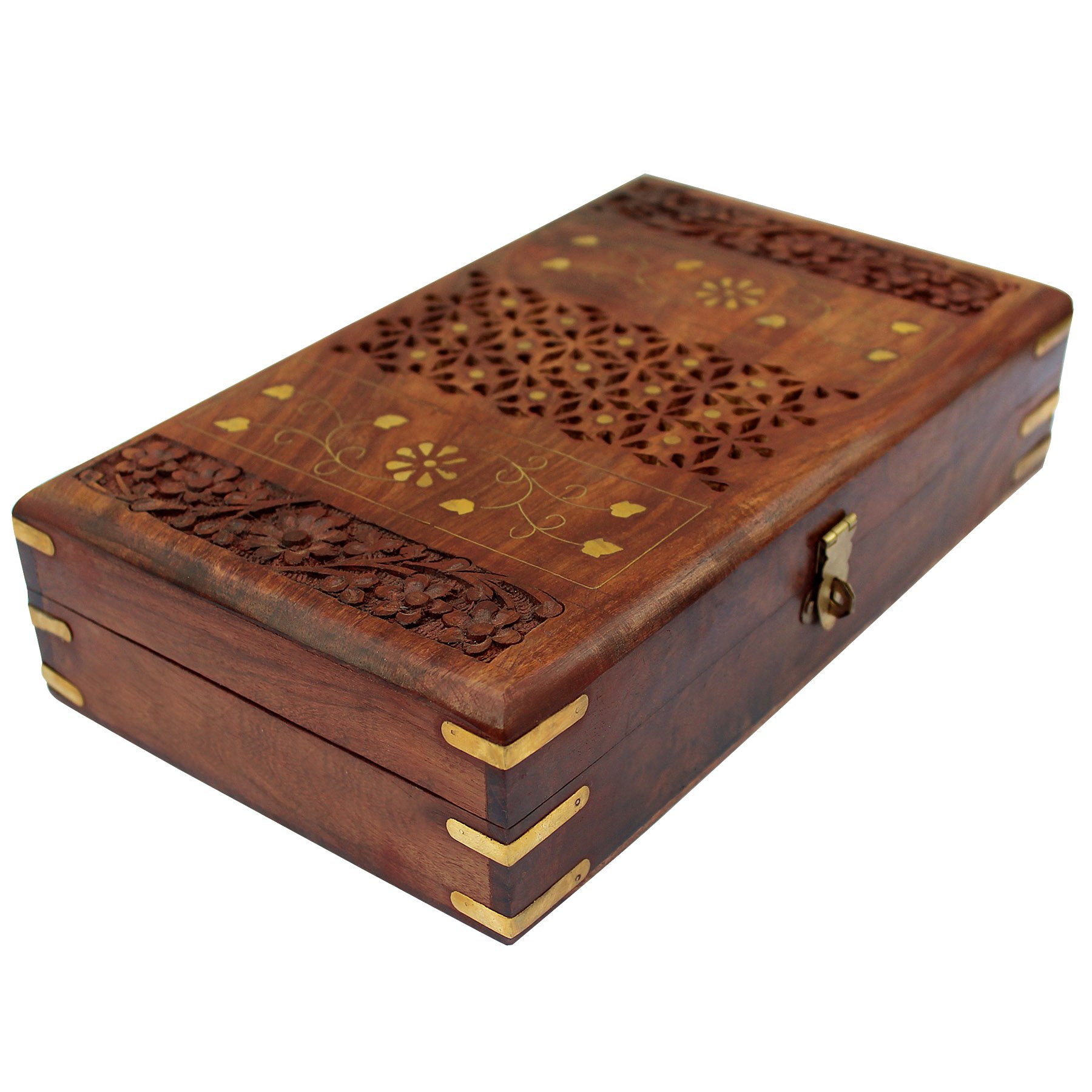 Protect and preserve your valuables with this handcrafted wooden jewelry box. You always want to keep your best valuables precious jewelry safely. This wooden jewelry box is ideal for organizing your jewellery collection. This classical wooden jewelry storage case has been built from real wood and polished gold hardware. A stylish way to keep your jewelry organized. This wooden jewelry box has a curved traditional design rich brown finish.