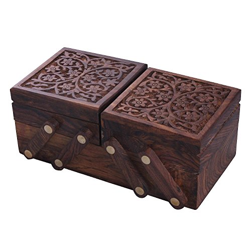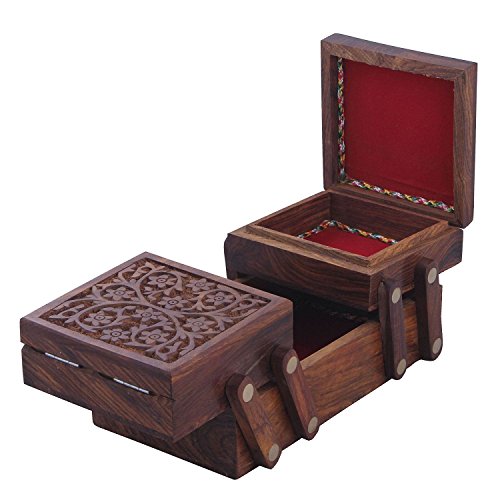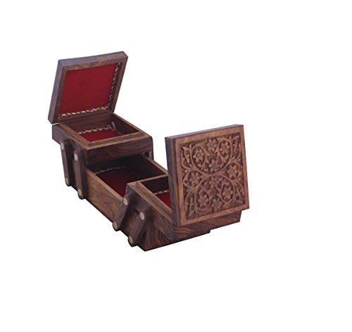 Protect and preserve your valuables with this beautiful handcrafted wooden multi cabinet sliding jewelry box. You always want to keep your best valuables precious jewelry safely. This wooden jewelry box is ideal for organizing your jewellery collection. This classical wooden jewelry storage case has been built from real wood and polished gold hardware. A stylish way to keep your jewelry organized. This wooden jewelry box has a curved traditional design rich brown finish.