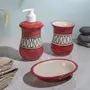 Bring in a fresh perspective to your bathroom with this beautiful red/black/white Pattern Ceramic 3 piece Bathroom Accessories Set made of premium quality ceramic it has plastic accessories to prevent rust and easy maintenance. The set contains a soap dish a brush holder a soap dispenser. This is bound to bring an organised resemblance to your washroom. Clean designs and convenient maintenance make this set a must have.