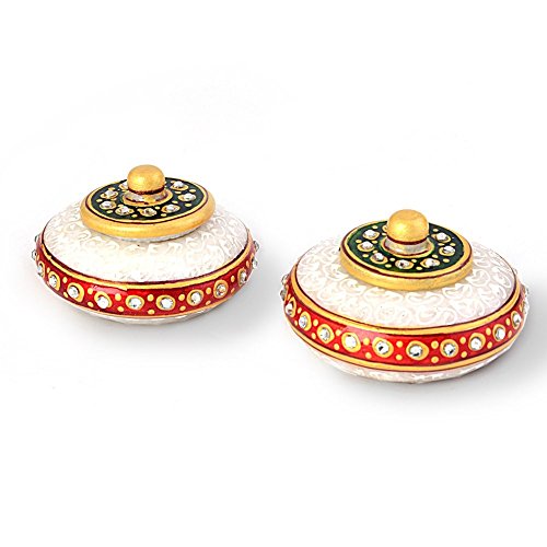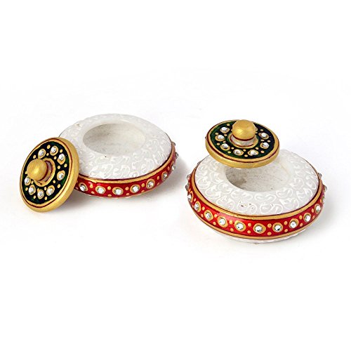This handcrafted sindoor box is made of marble. There is a lid to keep it closed after use. It is a beautifuljaipuri golden meenakari. The gift piece has been prepared by the master artisans of jaipur.