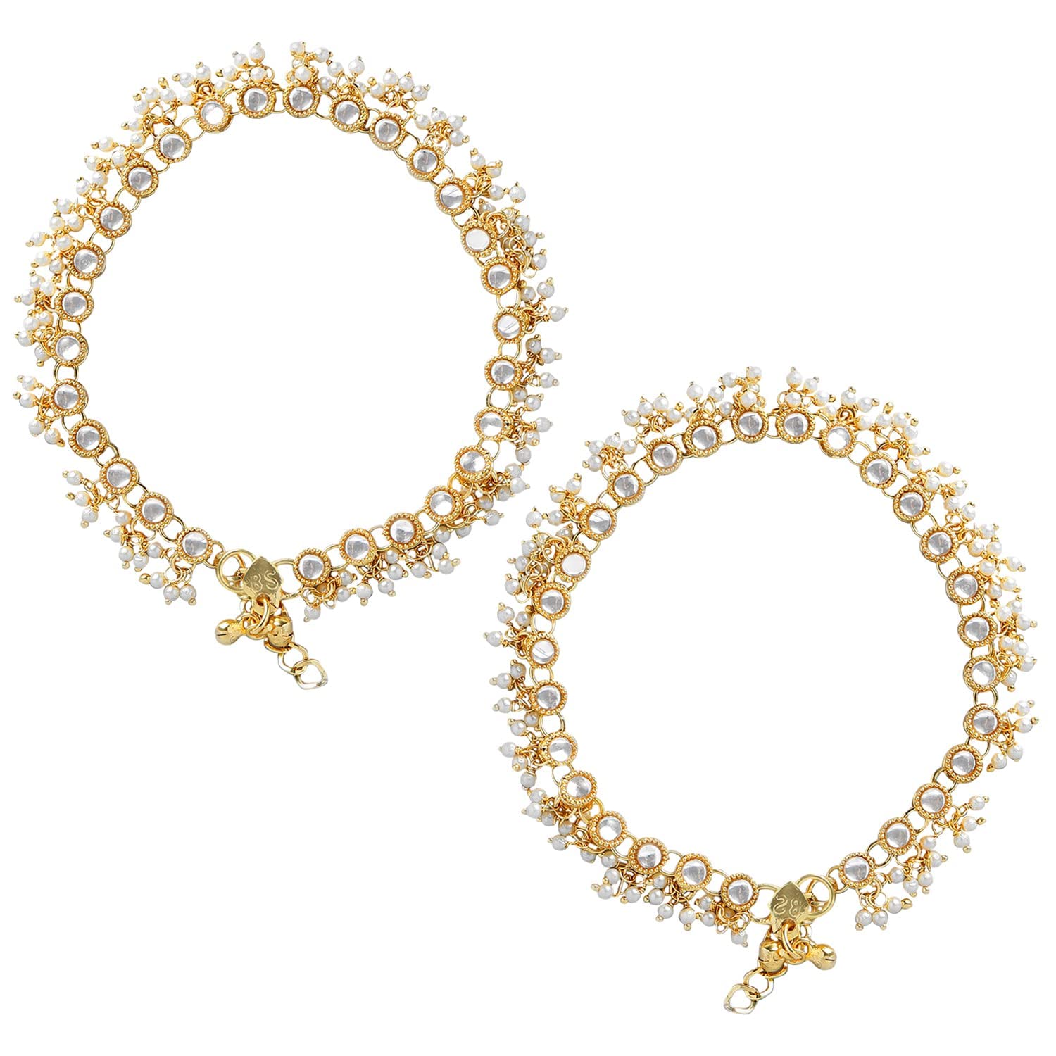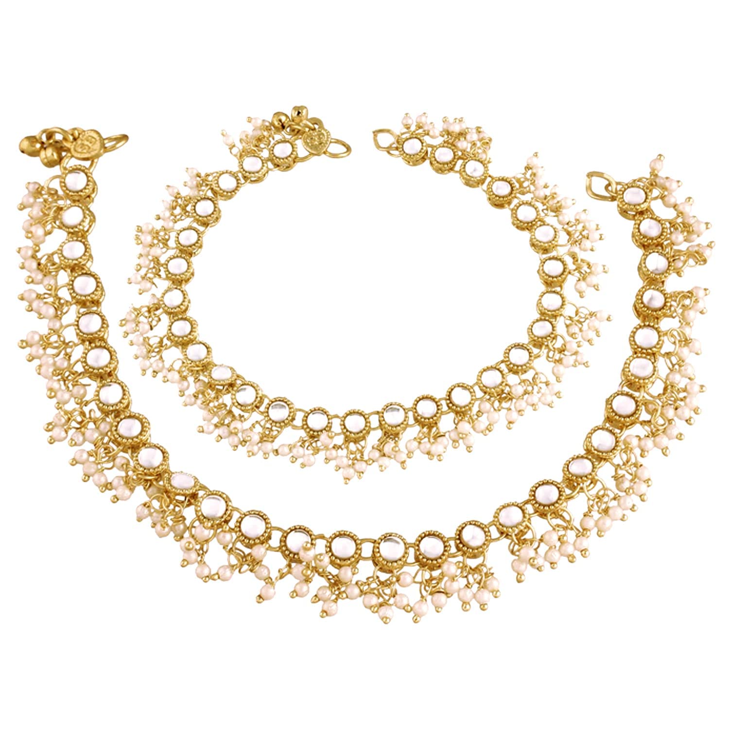 HomeFashionJewelleryAnkletsI Jewels Traditional Gold Plated Encased With Faux Kundan & Pearls Adjustable Pair Of Bridal White Anklets Payal For Women (A044W)