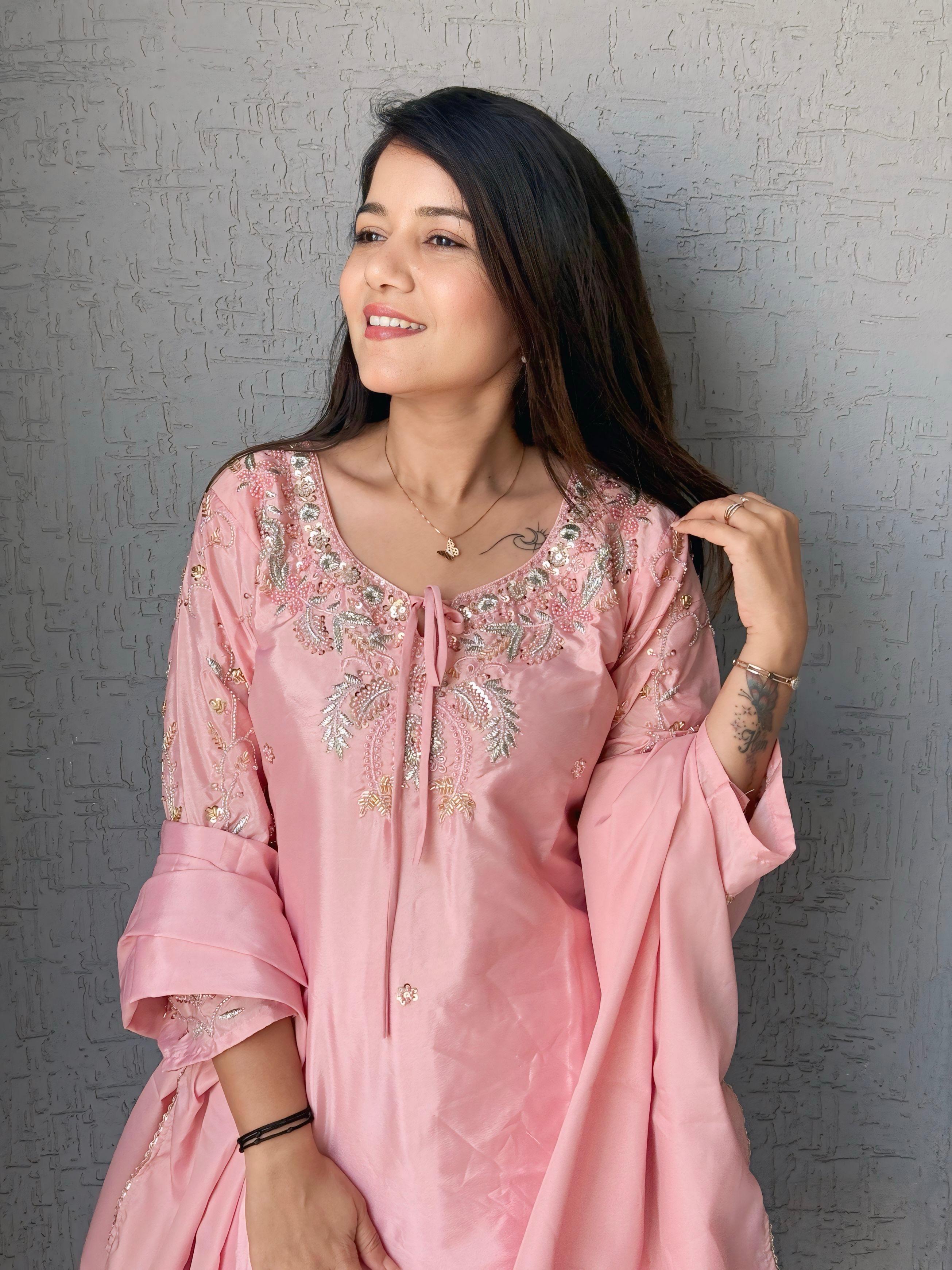 Baby Pink Crape Readymade Kurti Set with Beads Sequence Work