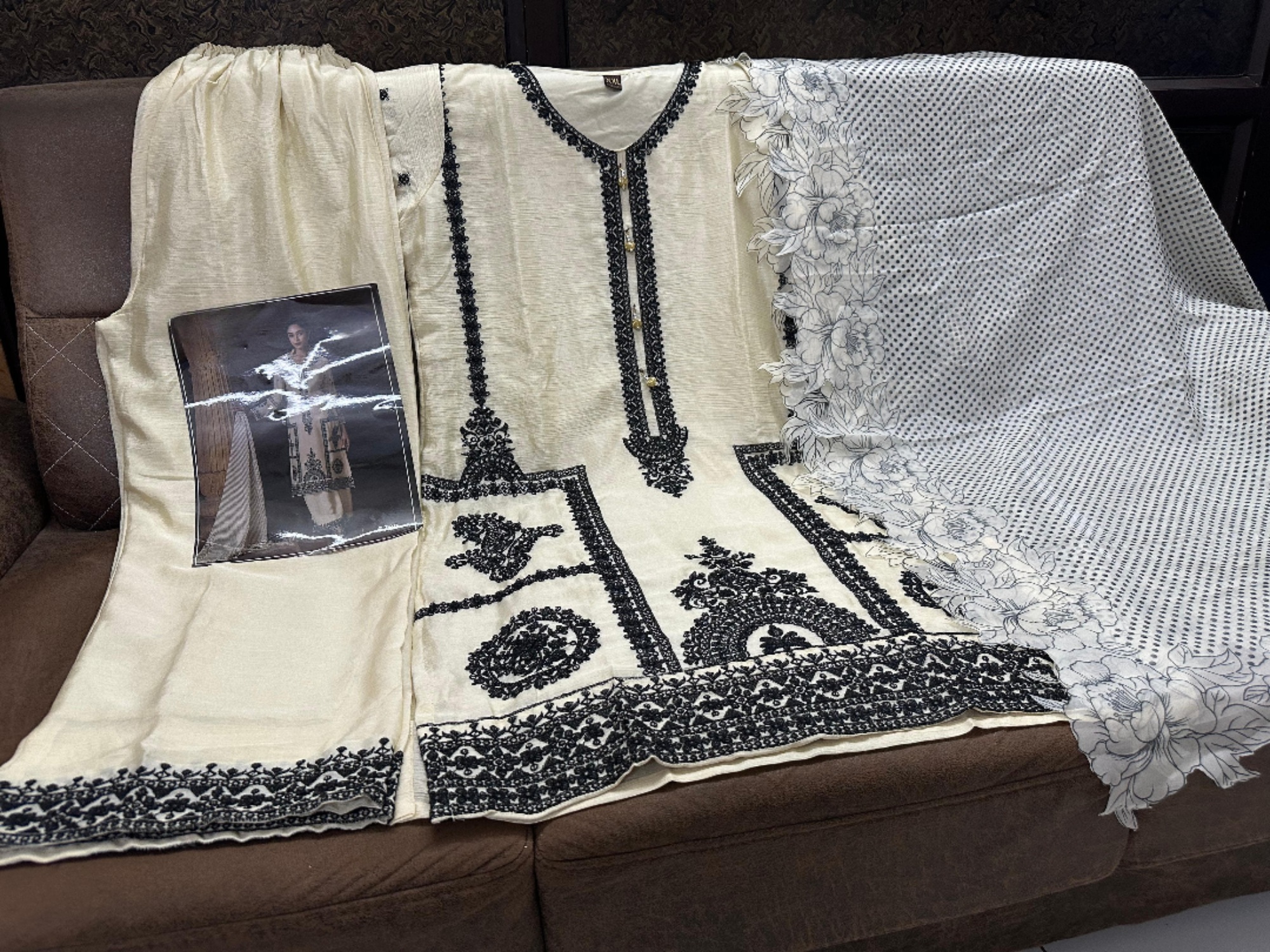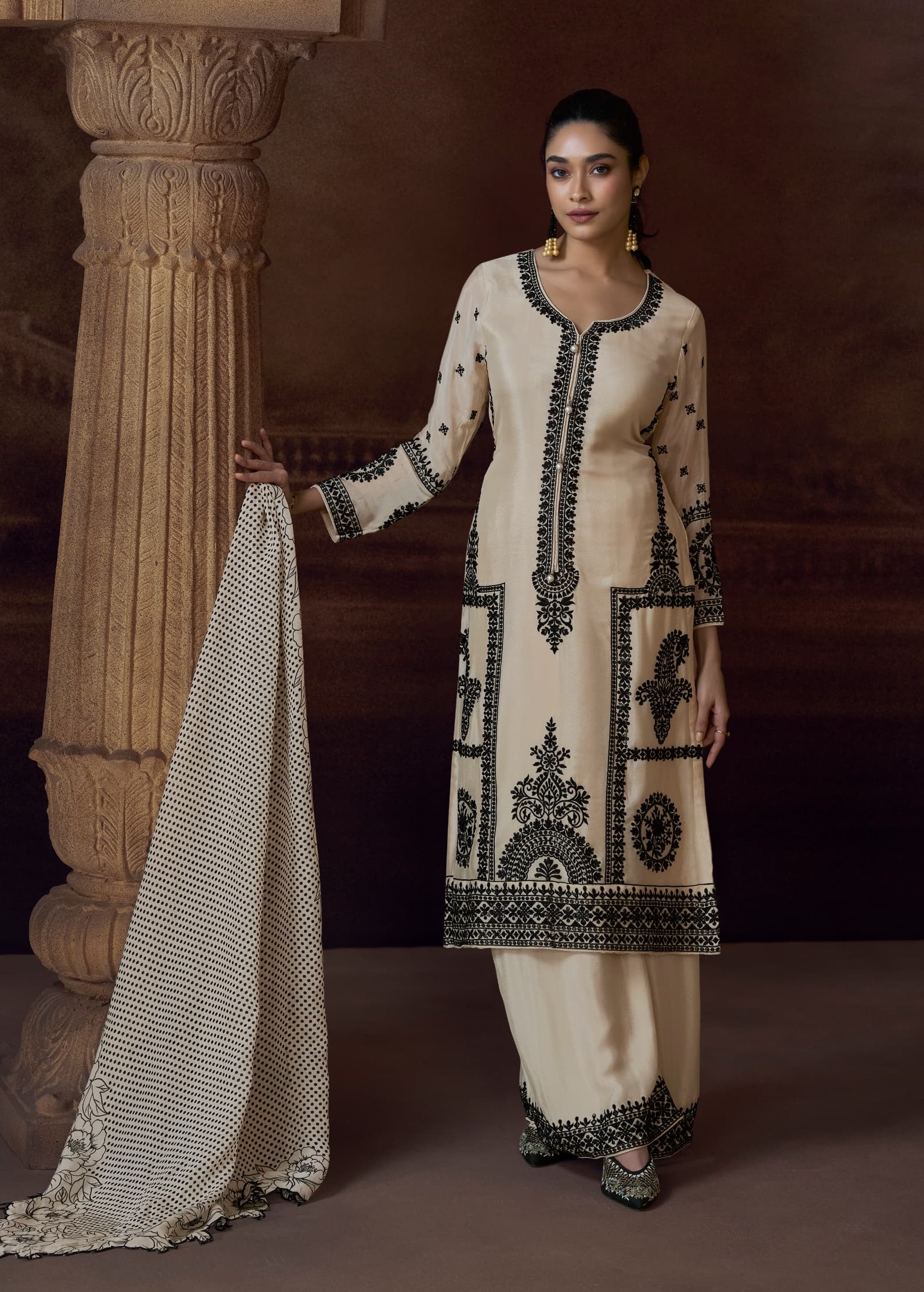 Beige heavy chinon free size stitched salwar suit with sequence embroidery work