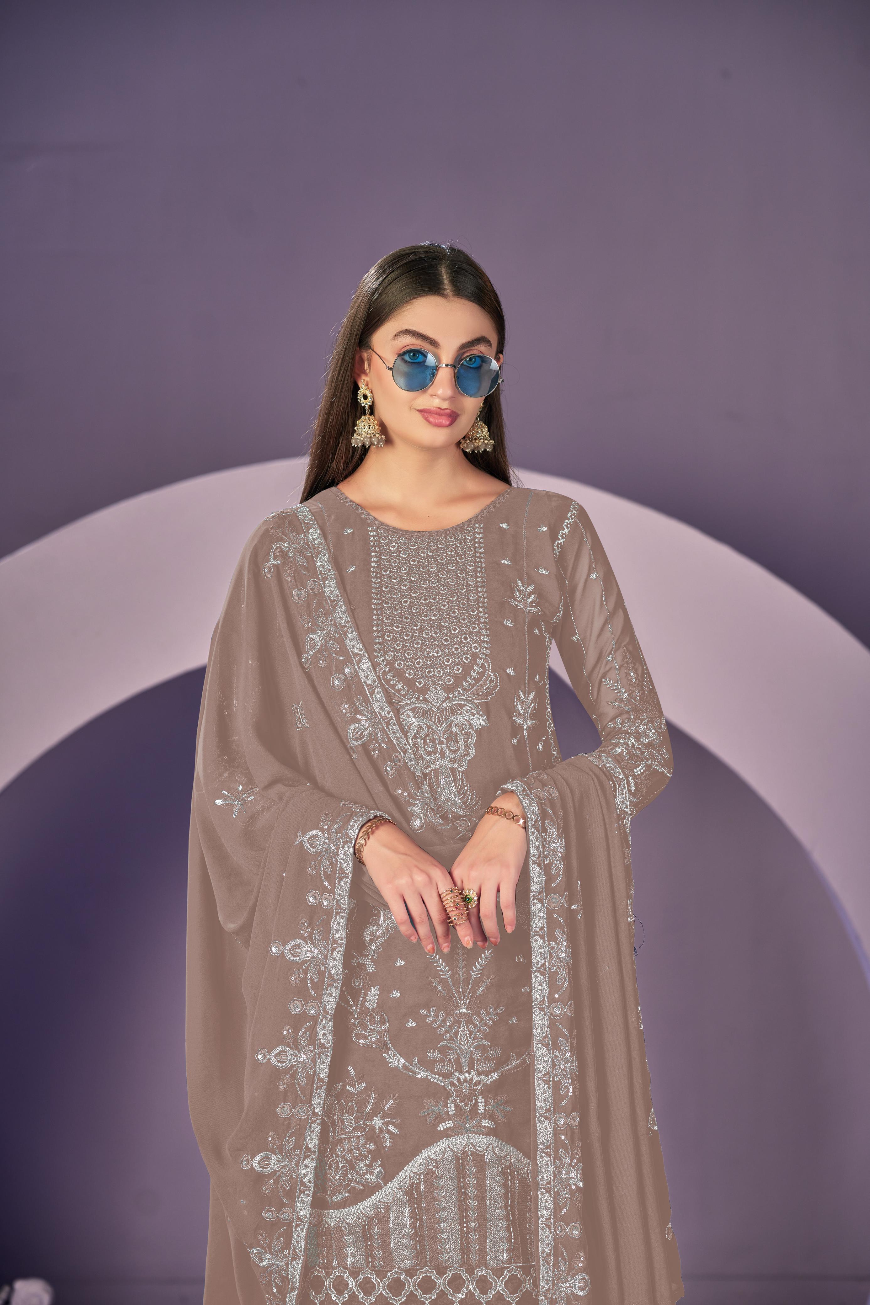 Beige heavy georgette embroidered semi stitched suit with khatli work