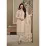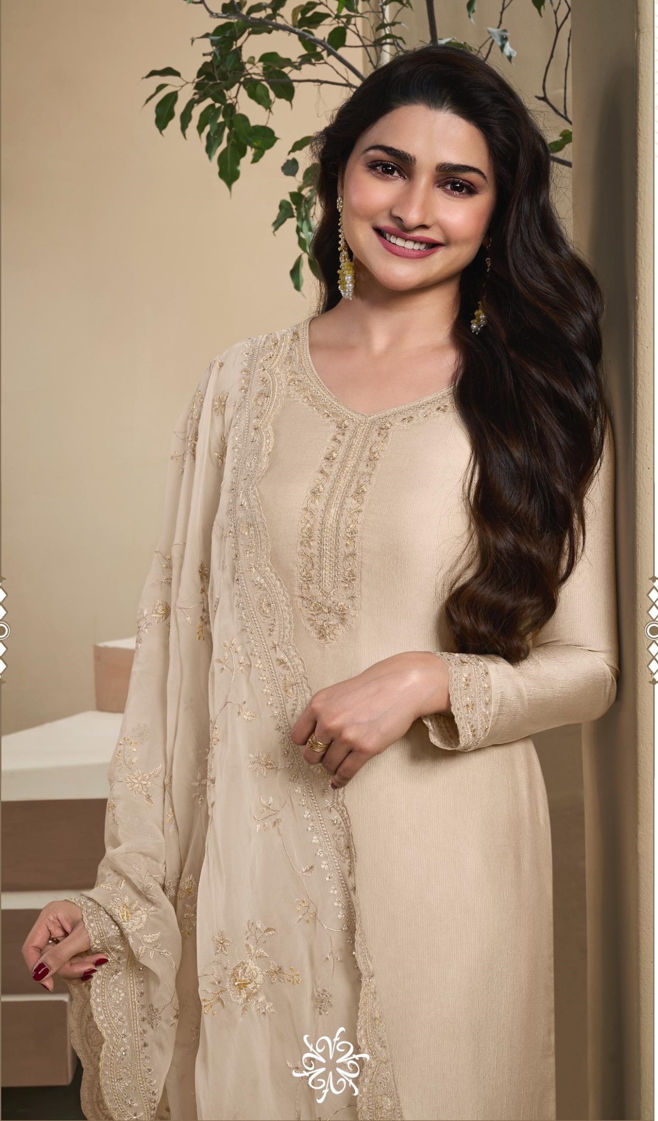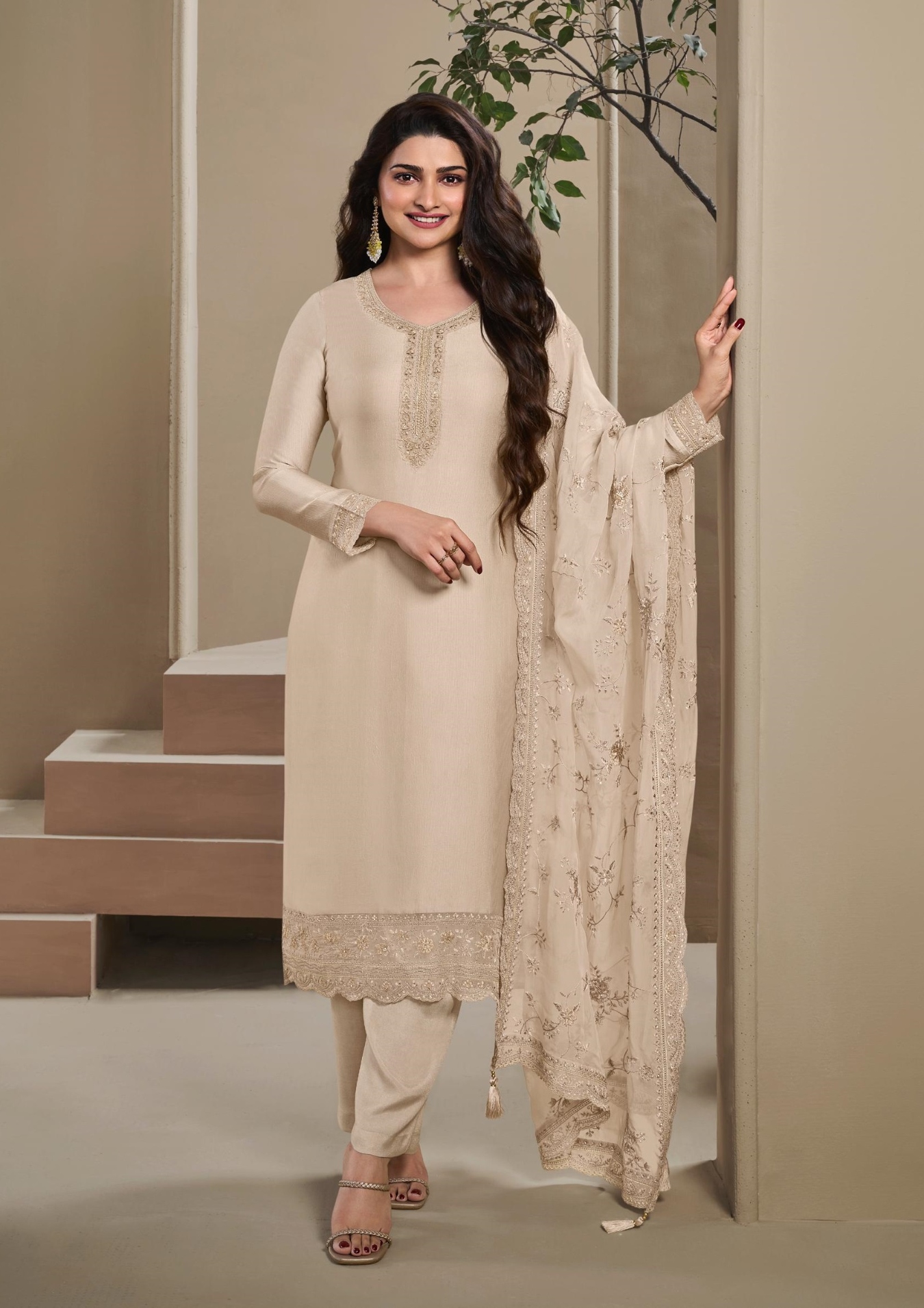Beige Heavy Natural Crepe Semi Stitched Suit with Embroidery & Zarkhan Work