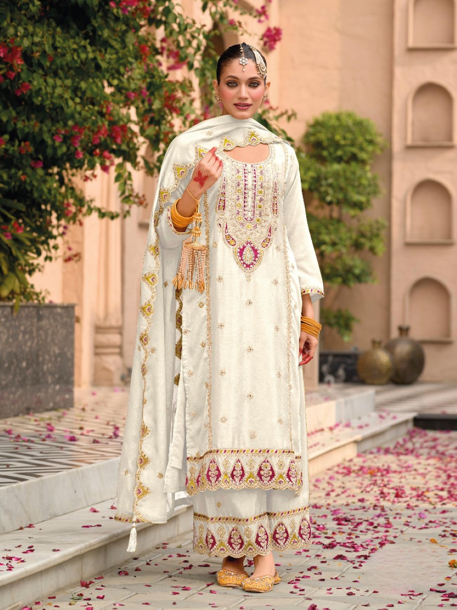 Beige Premium Embroidered Chinon Semi Stitched Salwar Suit