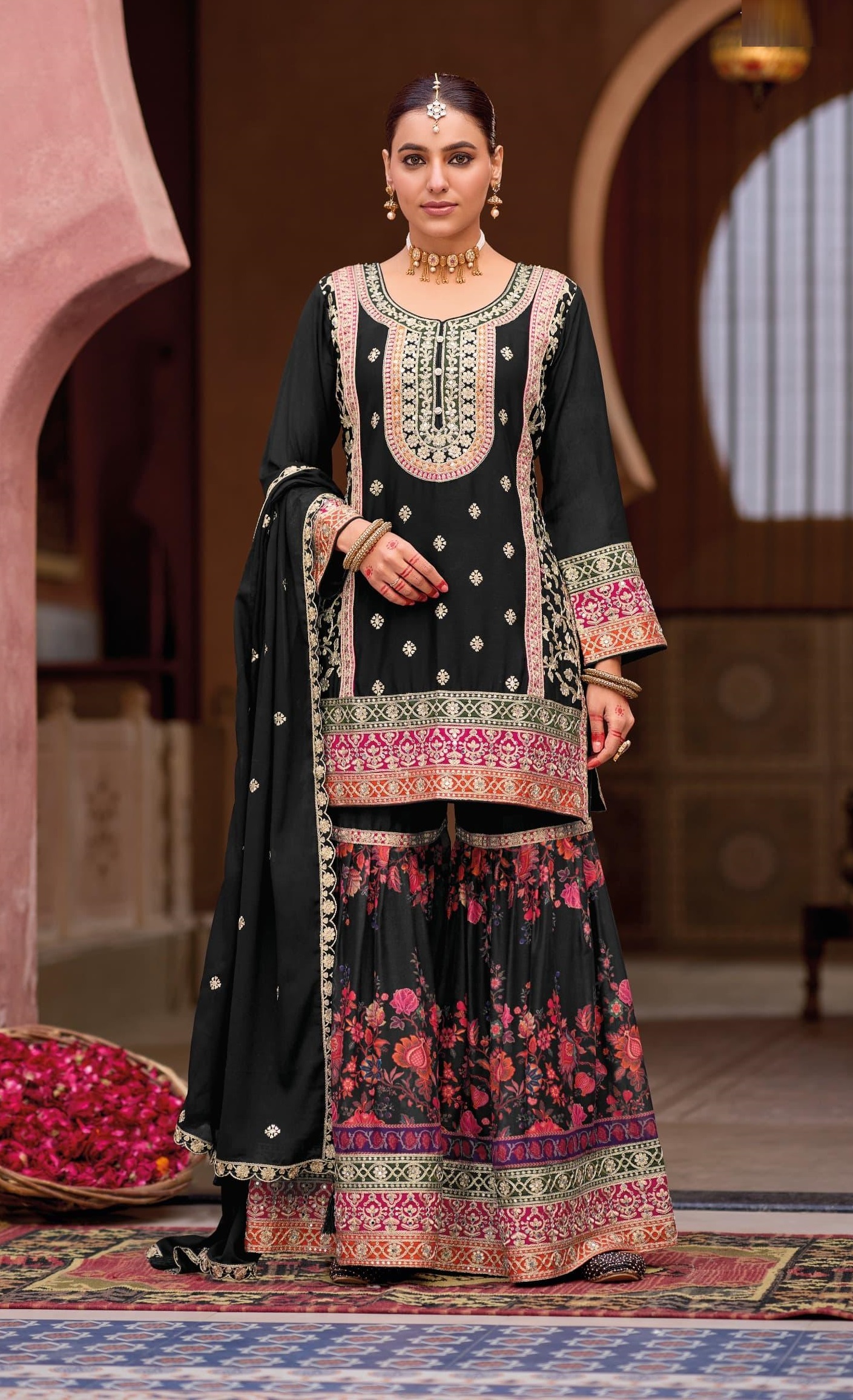 Black Chinon Embroidered Readymade Salwar Suit (Free Size)