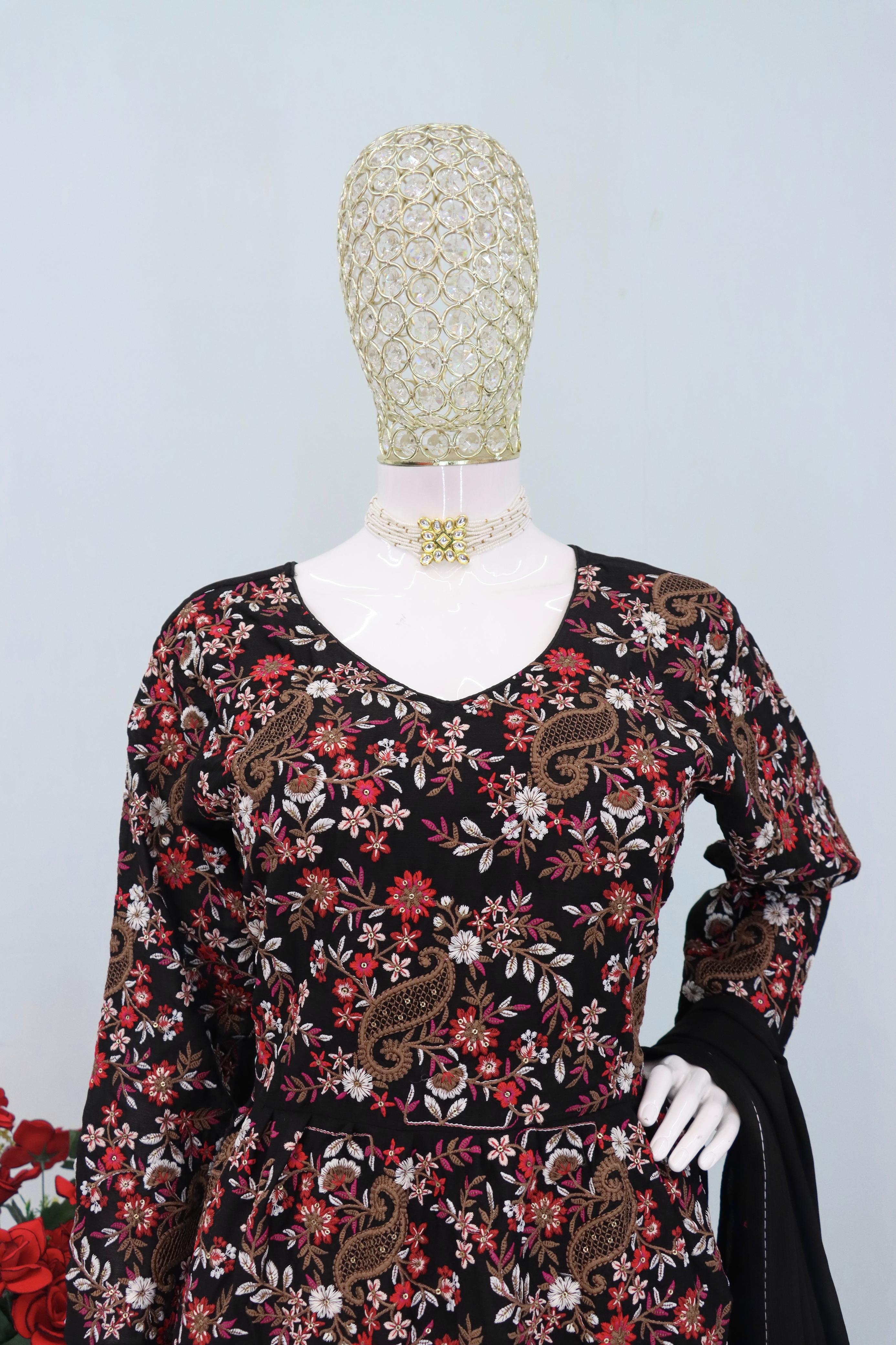 Black Chinon Embroidered With Squence Work Free Size Salwar Suit