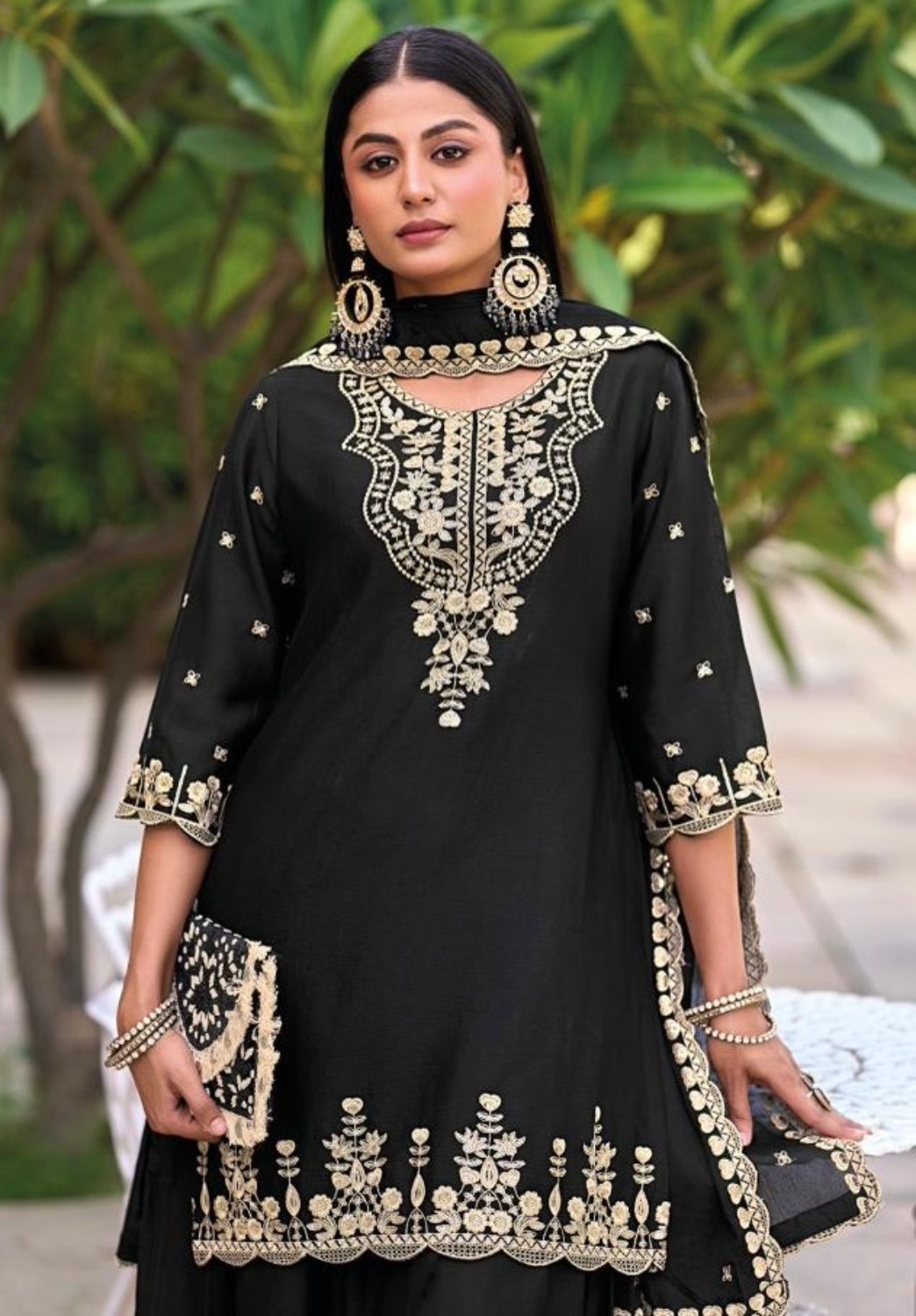 Black Chinon Readymade Plazzo Suit with Heavy Embroidery Work