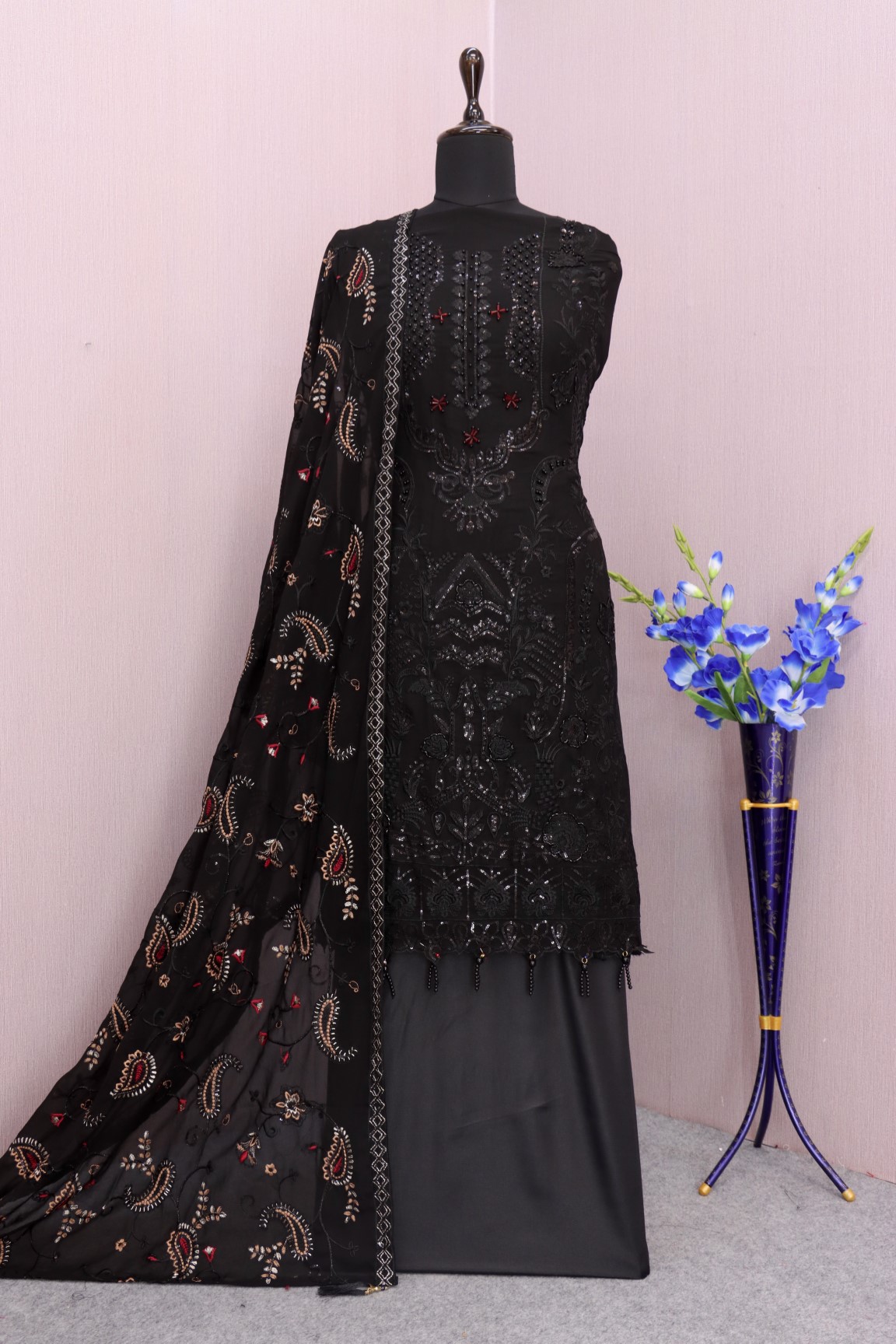 Black Embroidered Faux Georgette Semi Stitched Salwar Suit
