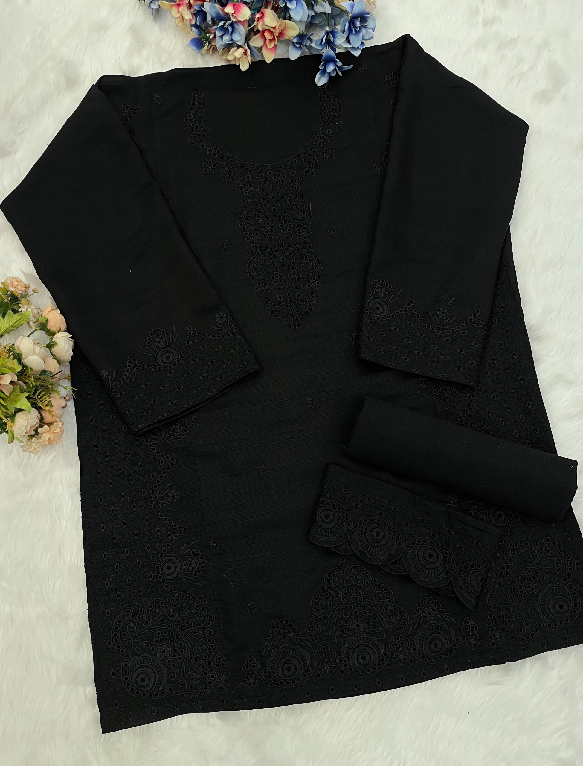 Black Embroidery and Thread Work Cotton Semi Stitched Salwar Suit