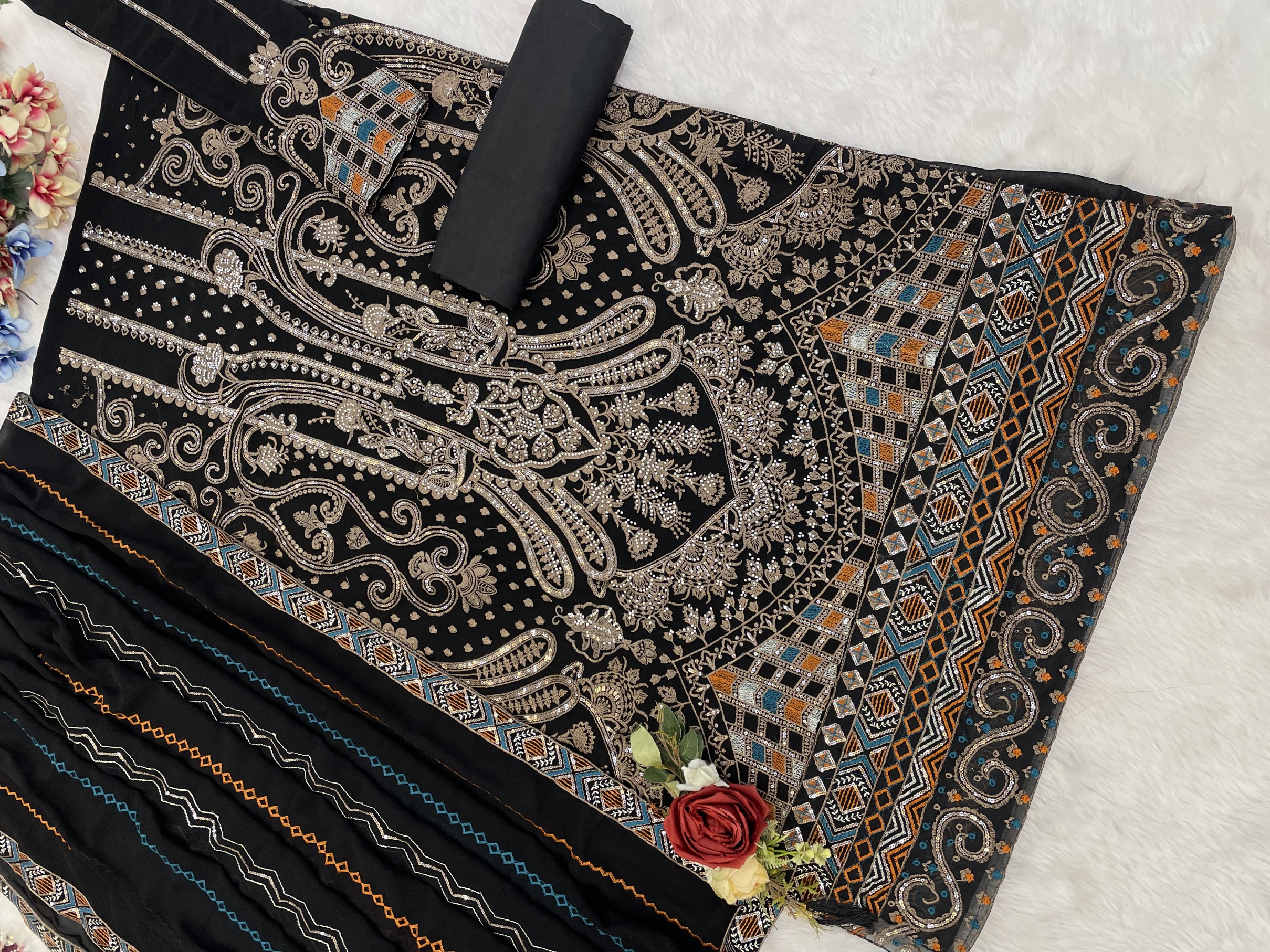 Black Georgette Semi Stitched Suit with Embroidered & Multi Thread Zarkan Work
