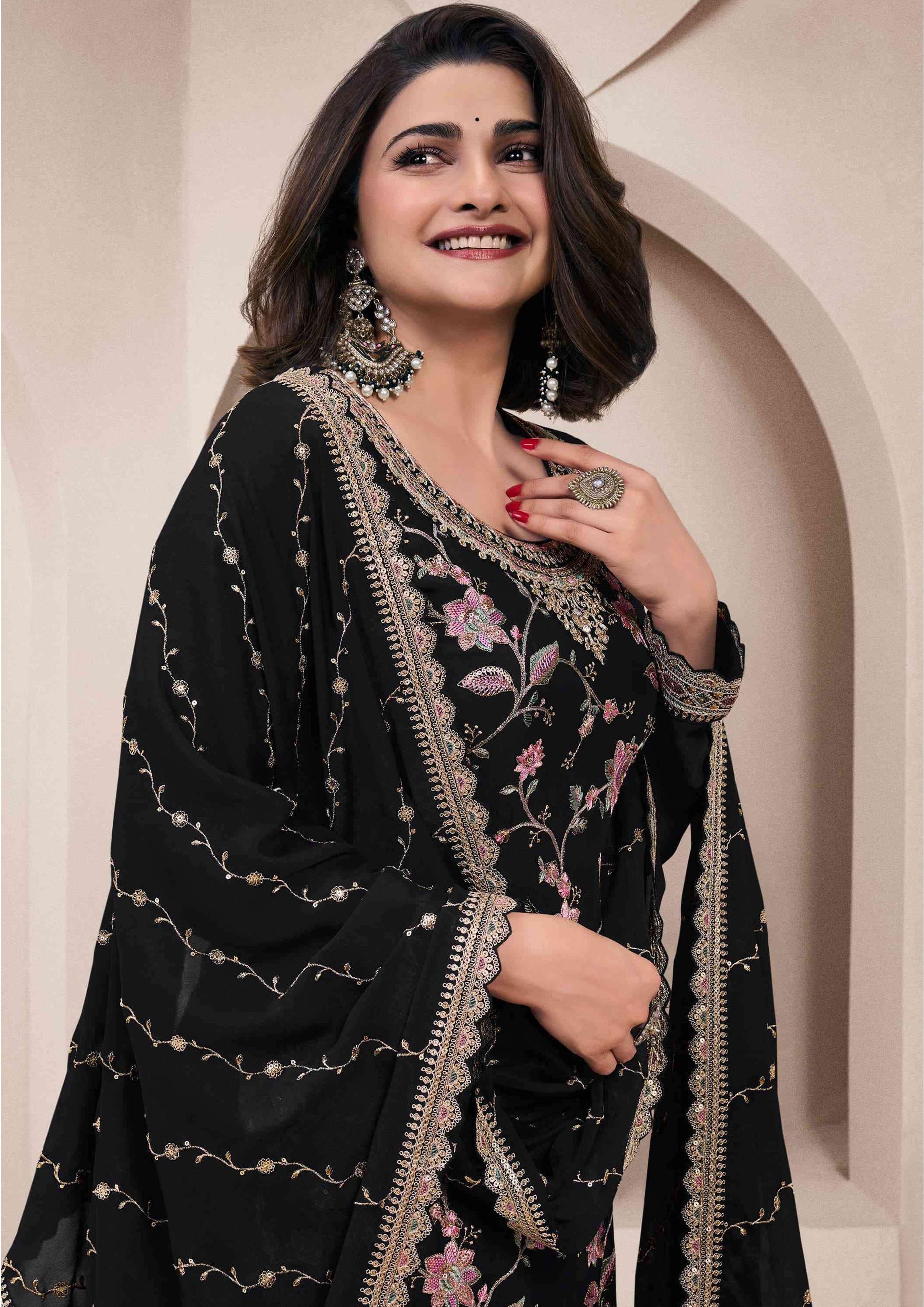 Black Heavy Chinon With Embroidery Sharara Suit (bottom Stitched)