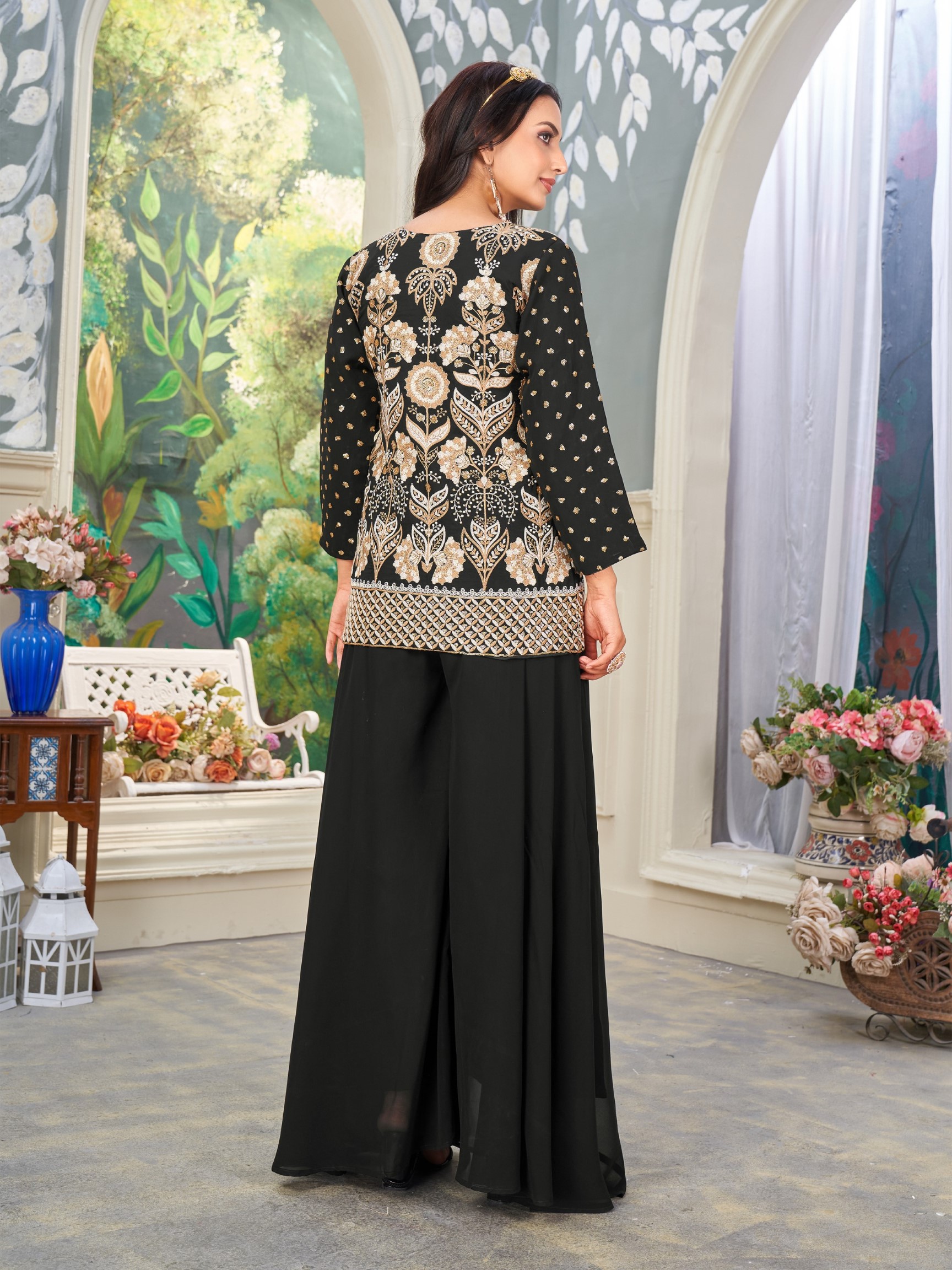 Black Heavy Embroidered Faux Georgette Stitched Plazzo Suit
