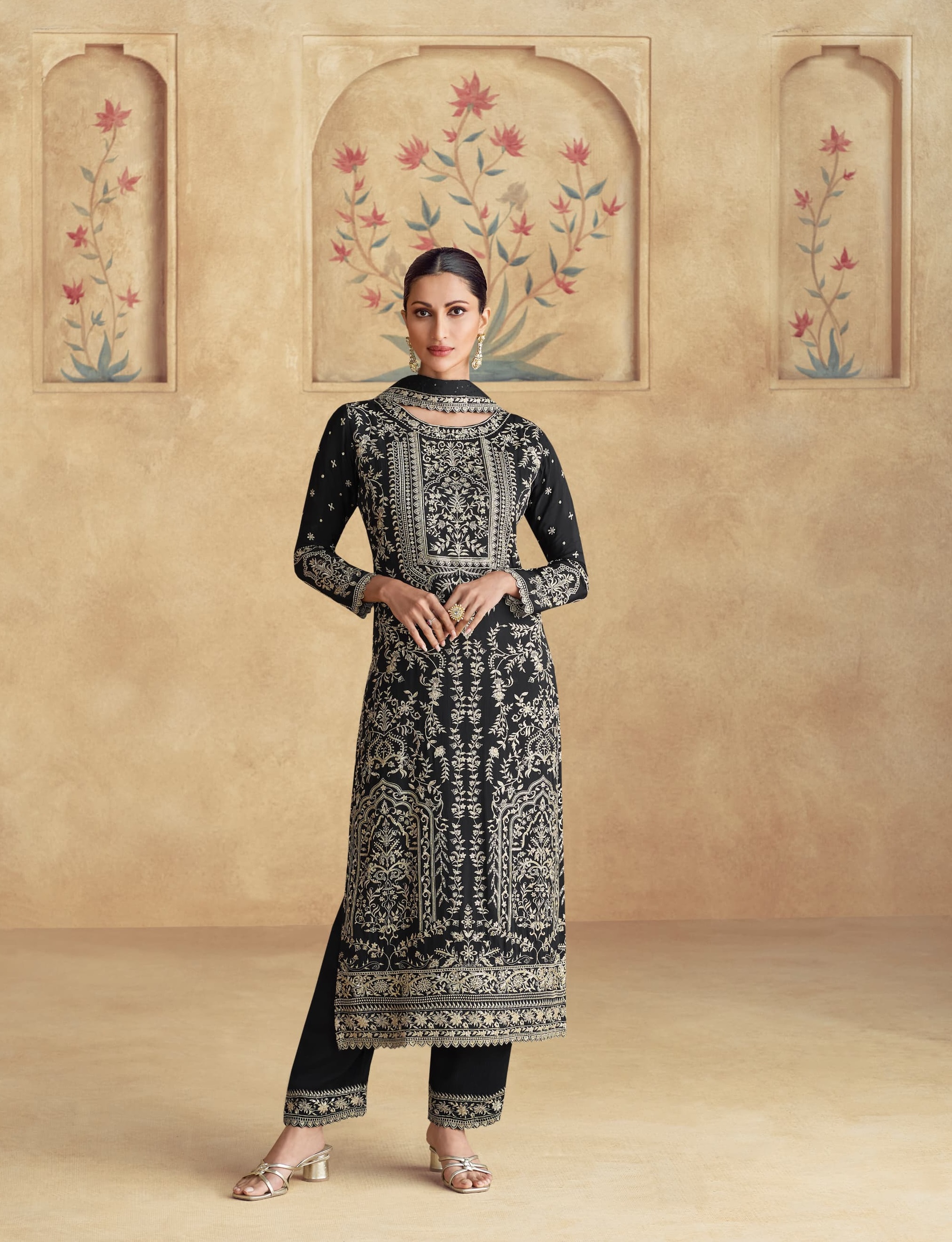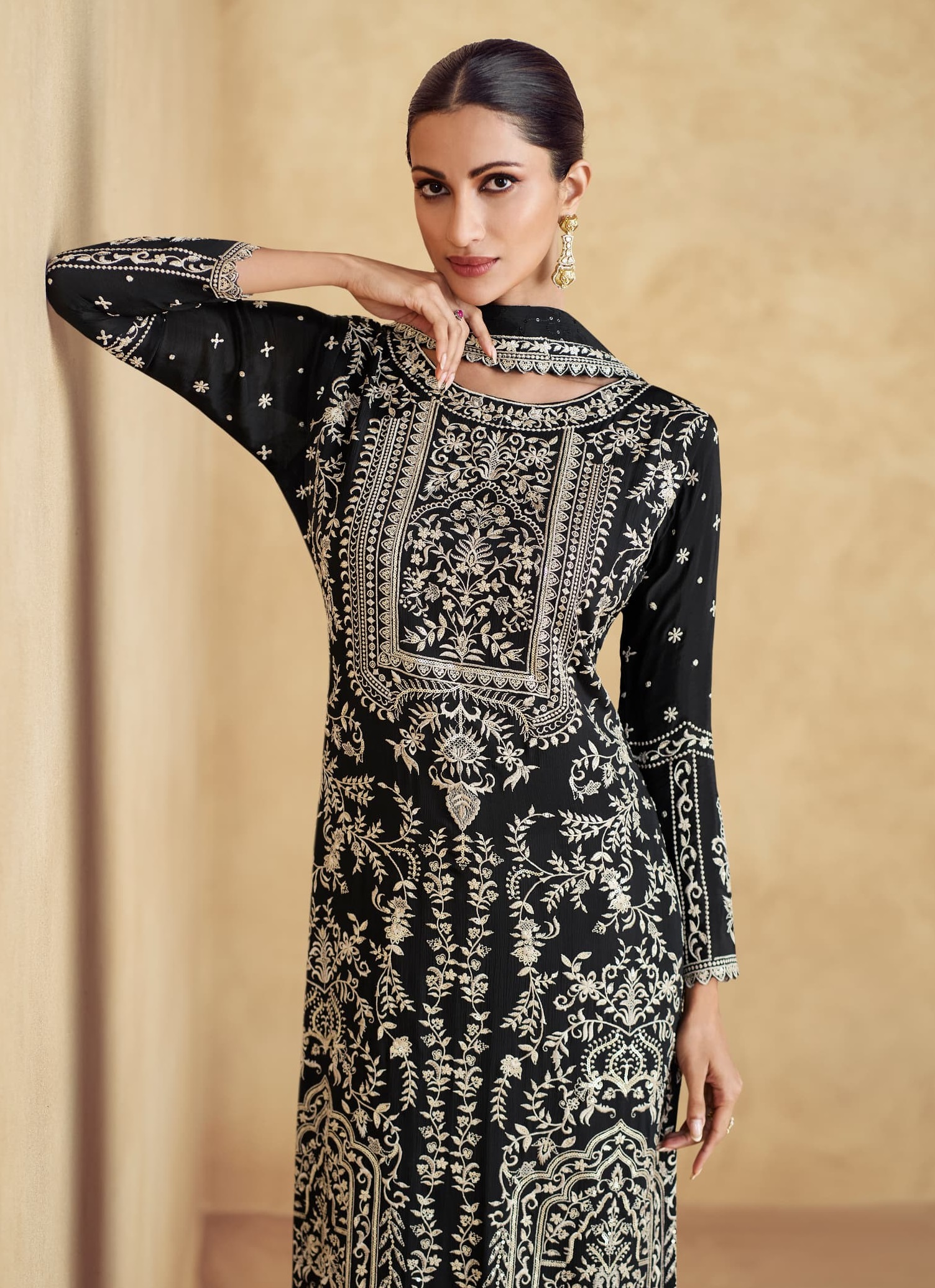 Black Primium Chinon Embroidered Sequence Work Ready Made Suit (Free Size)