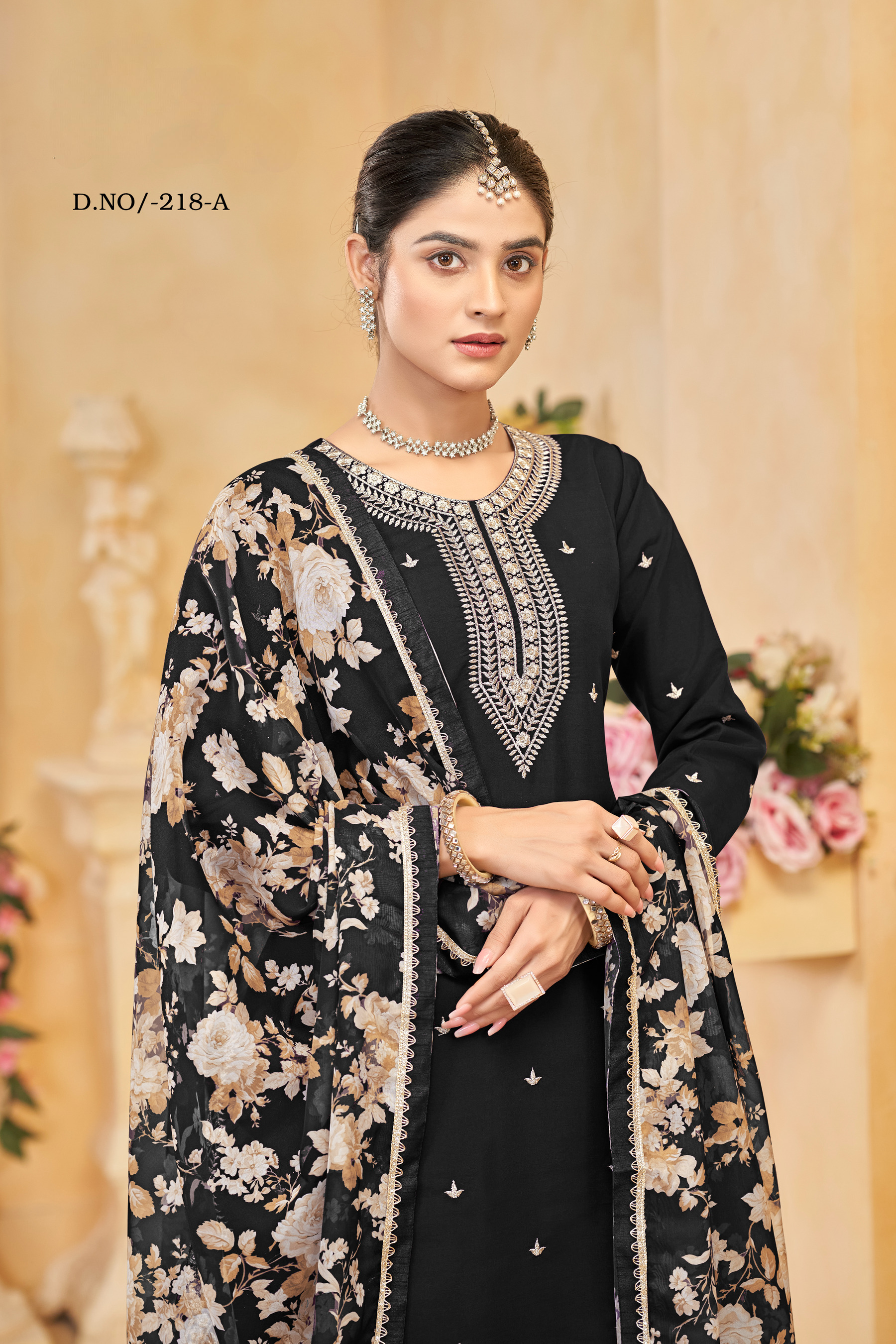 Black Roman Silk Embroidered Semi-Stitched Salwar Suit