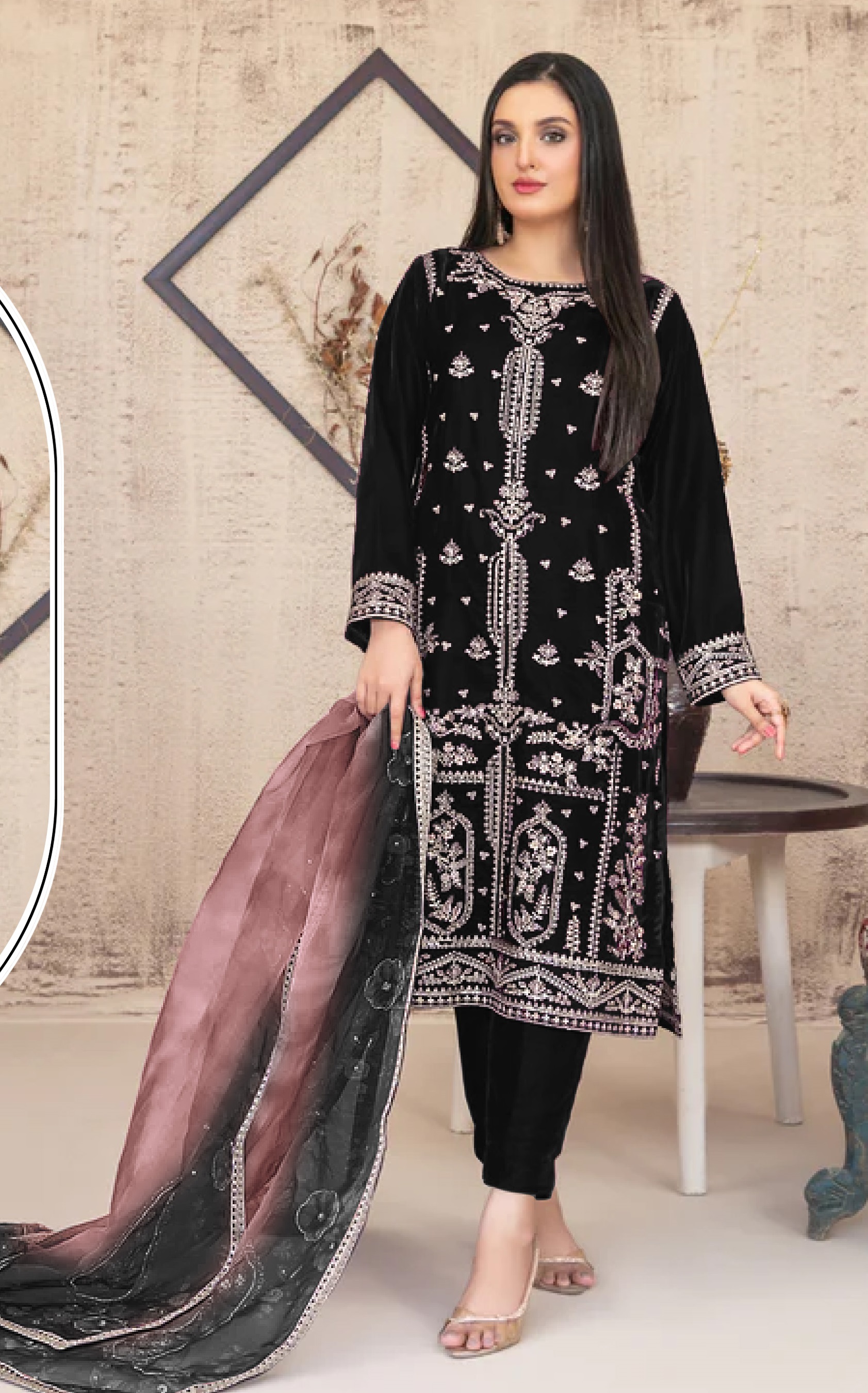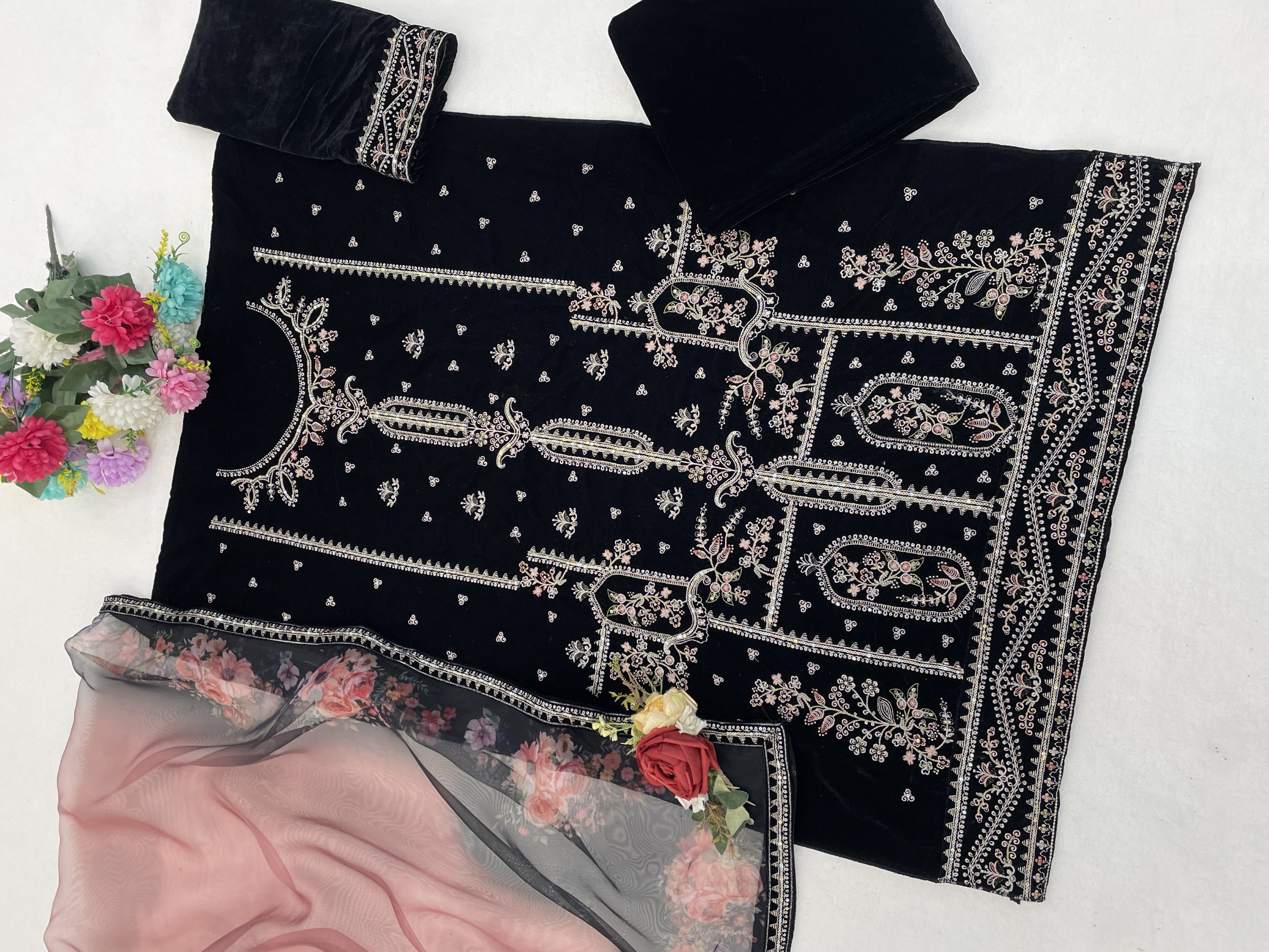 Black Velvet Semi Stitched Suit with Embroidery Sequence Work