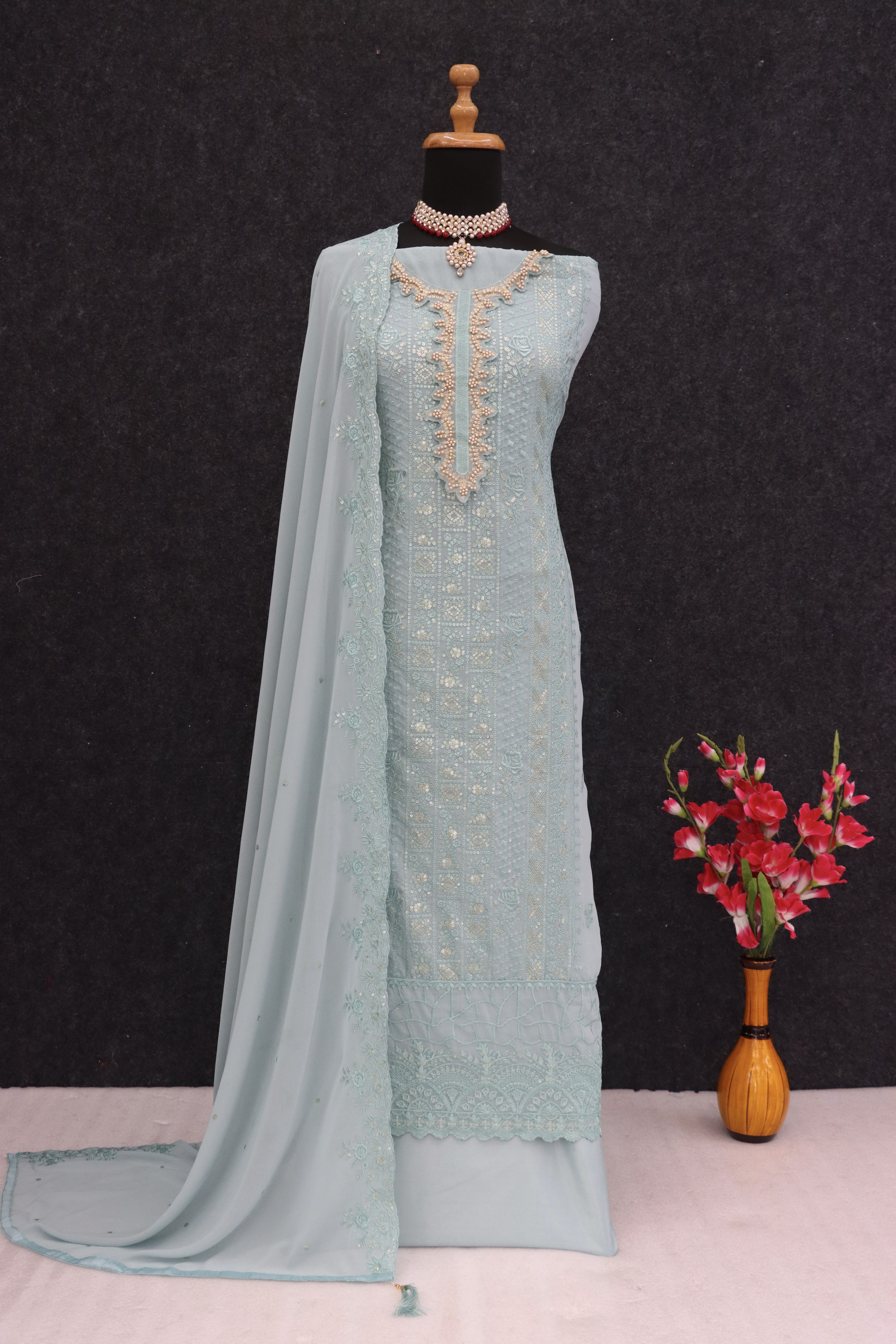 Blue Georgette Semi Stitched Suit with Sequence & Multi Thread Work