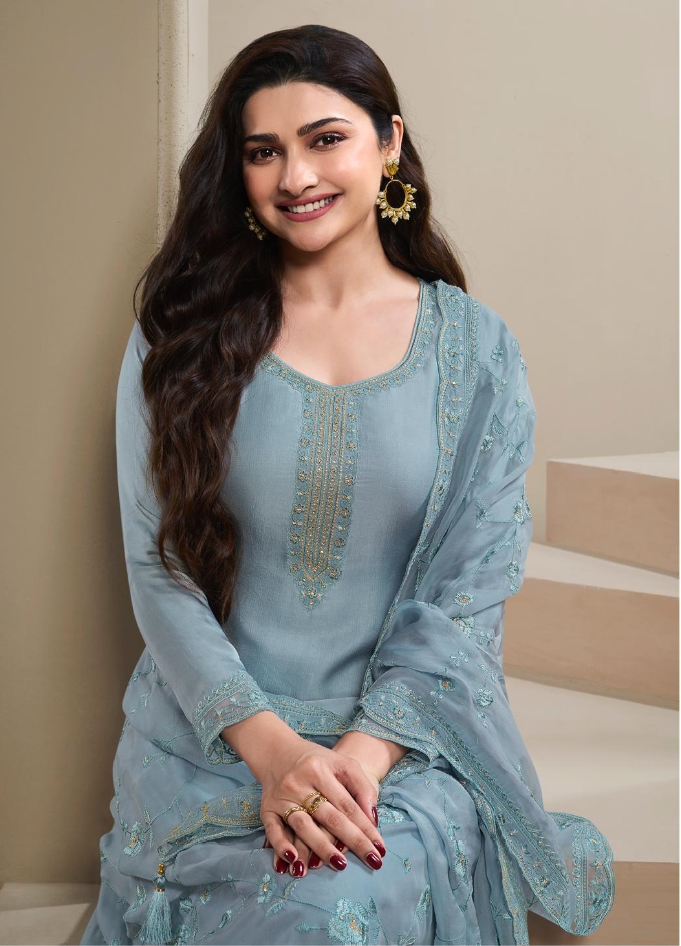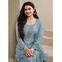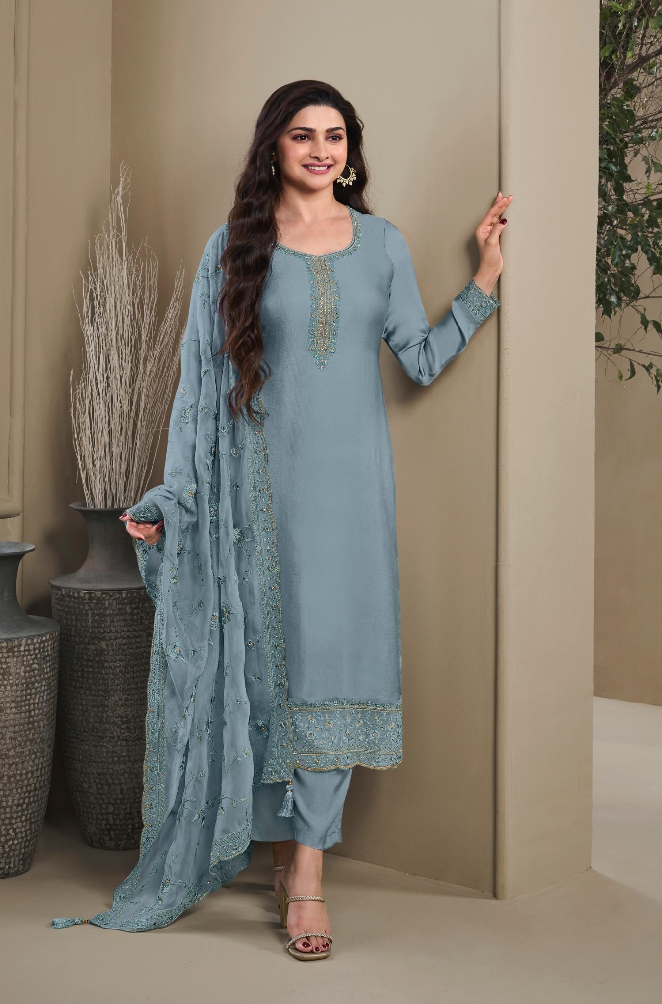 Blue Heavy Natural Crepe Semi Stitched Suit with Embroidery & Zarkhan Work