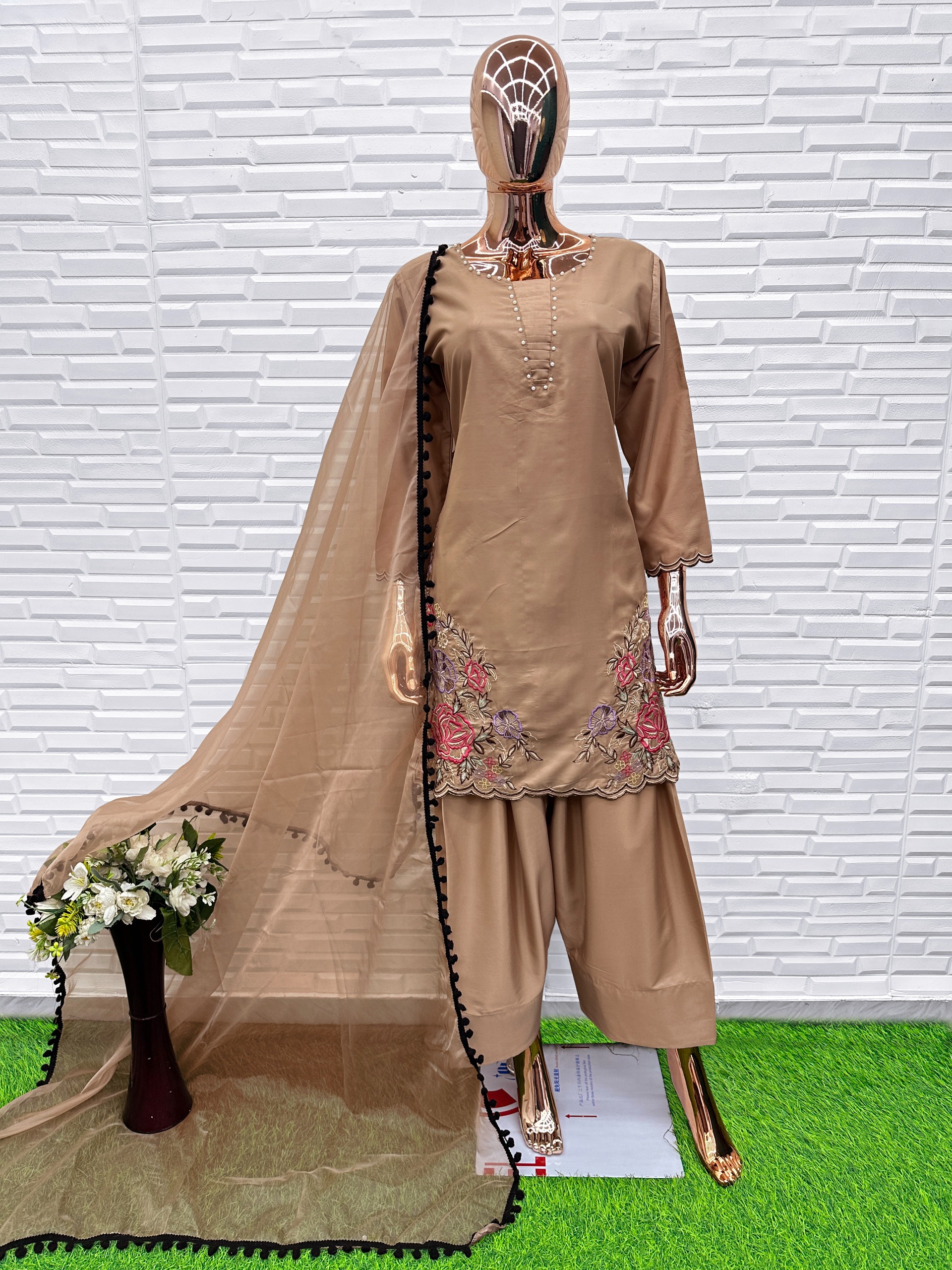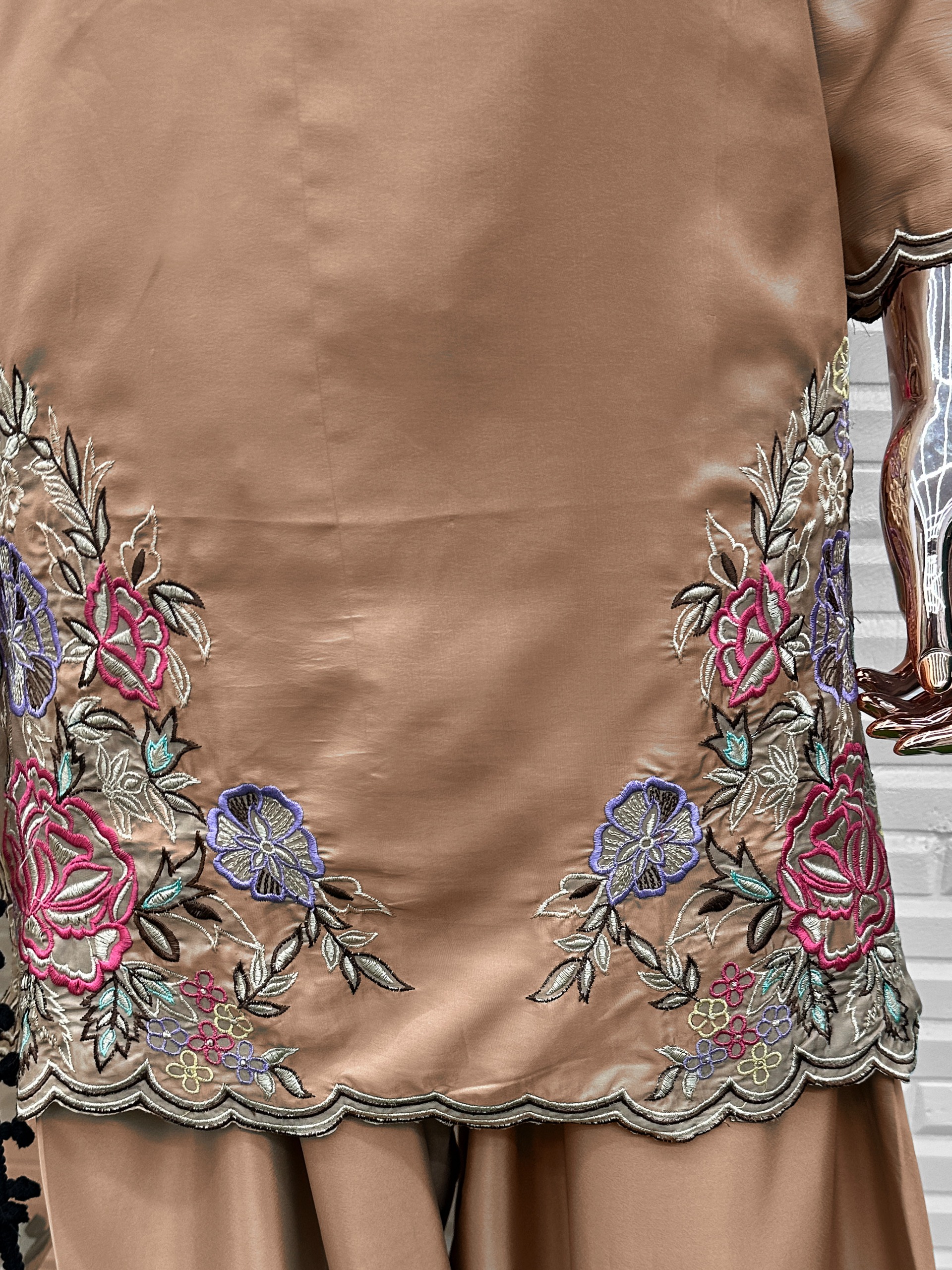 Brown Crape Readymade Salwar Suit with Embroidery & Sequence Work