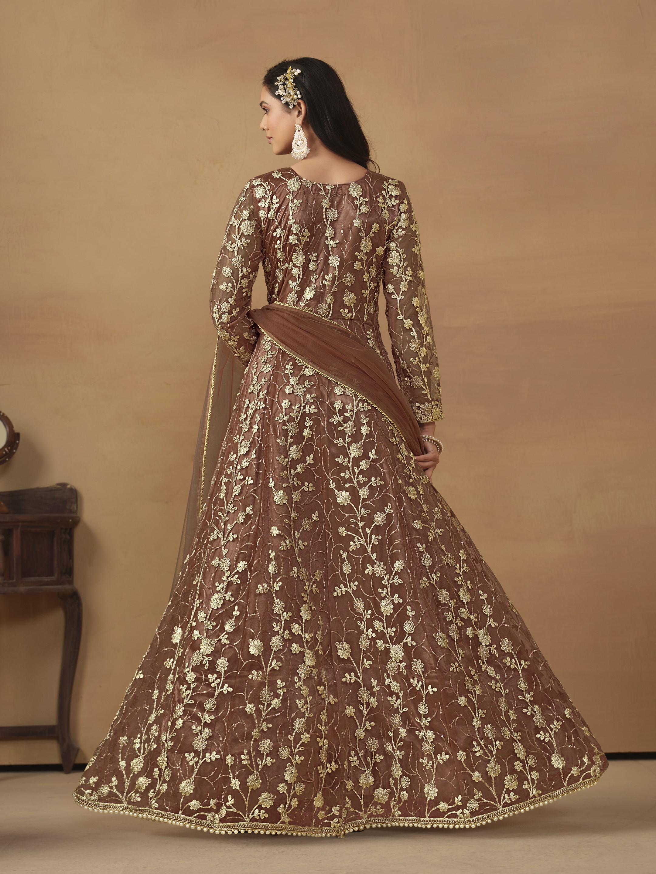 Brown Embroidered Butterfly Net Semi Stitched Anarkali Suit
