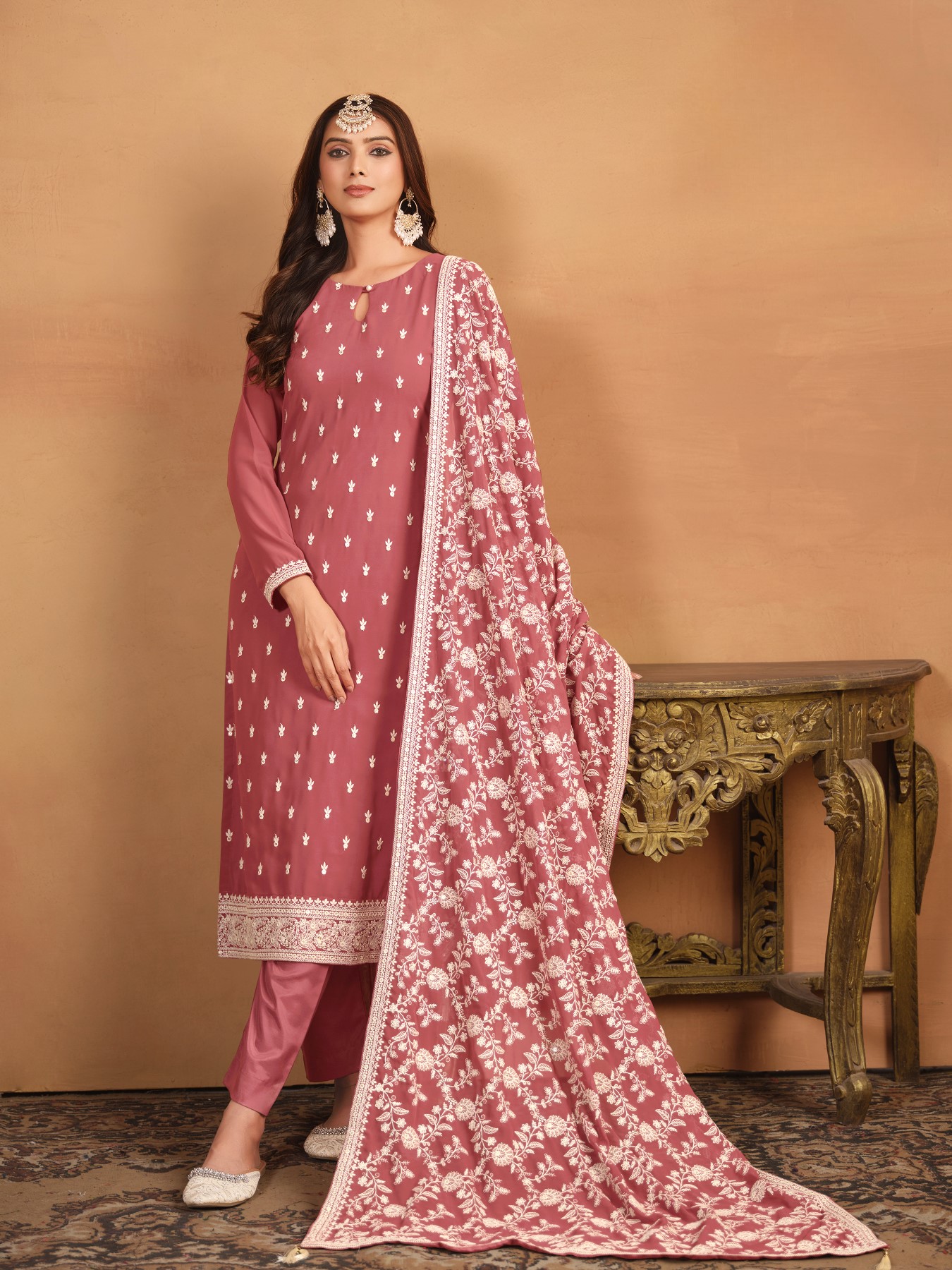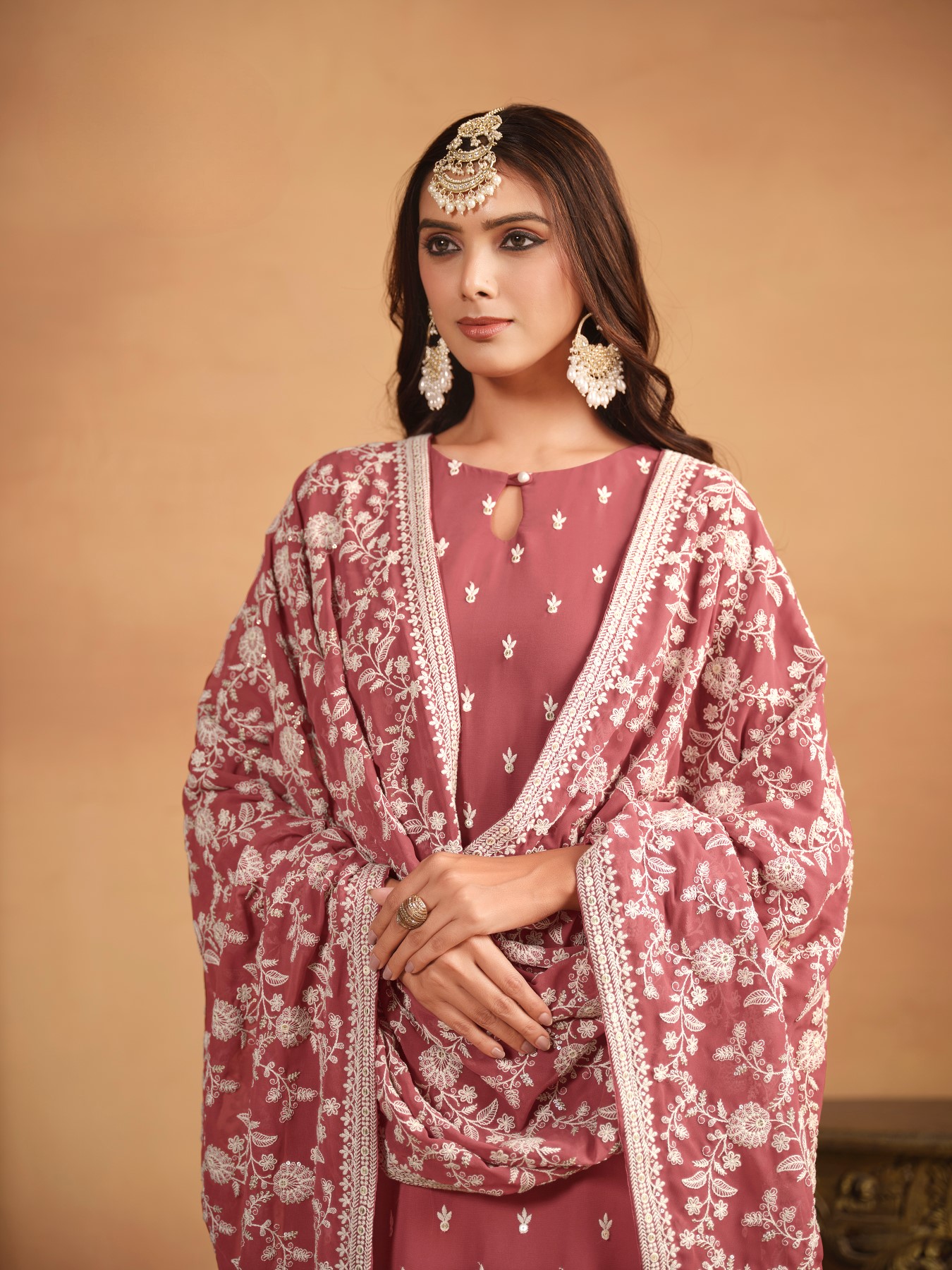 Brown Embroidered Faux Georgette Semi Stitched Salwar Suit