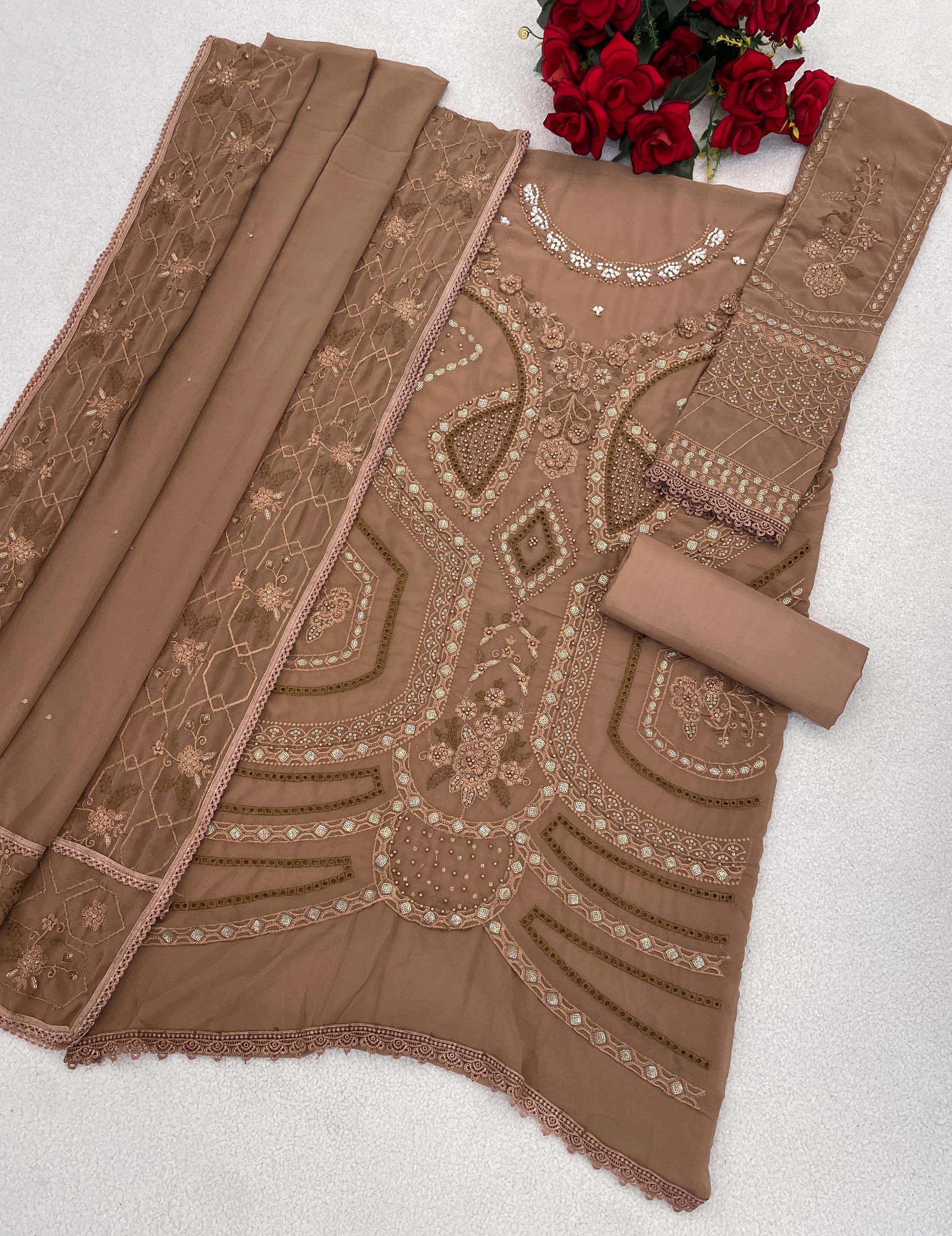 Brown Georgette Semi Stitched Suit with Embroidery Sequence & Moti work
