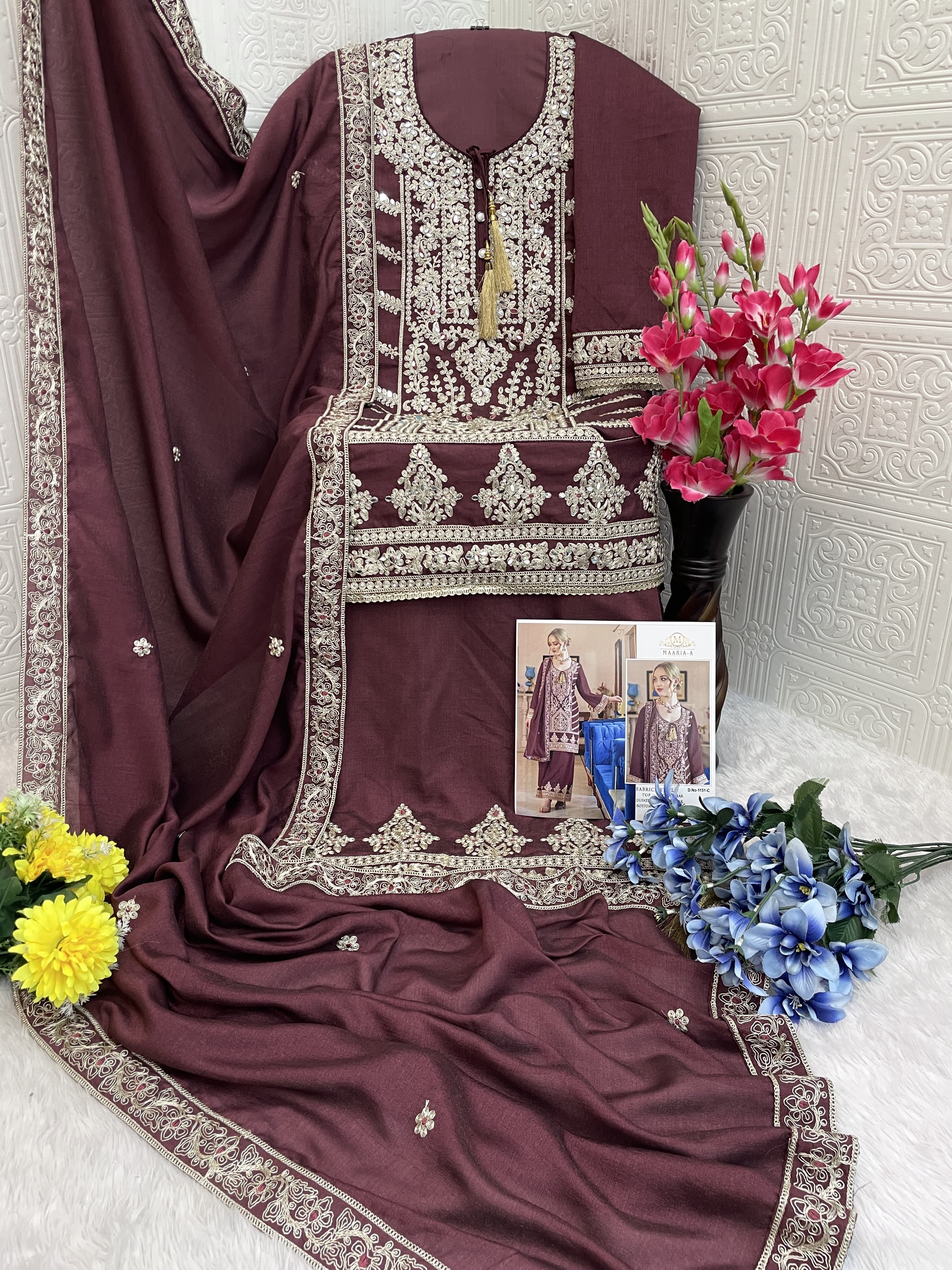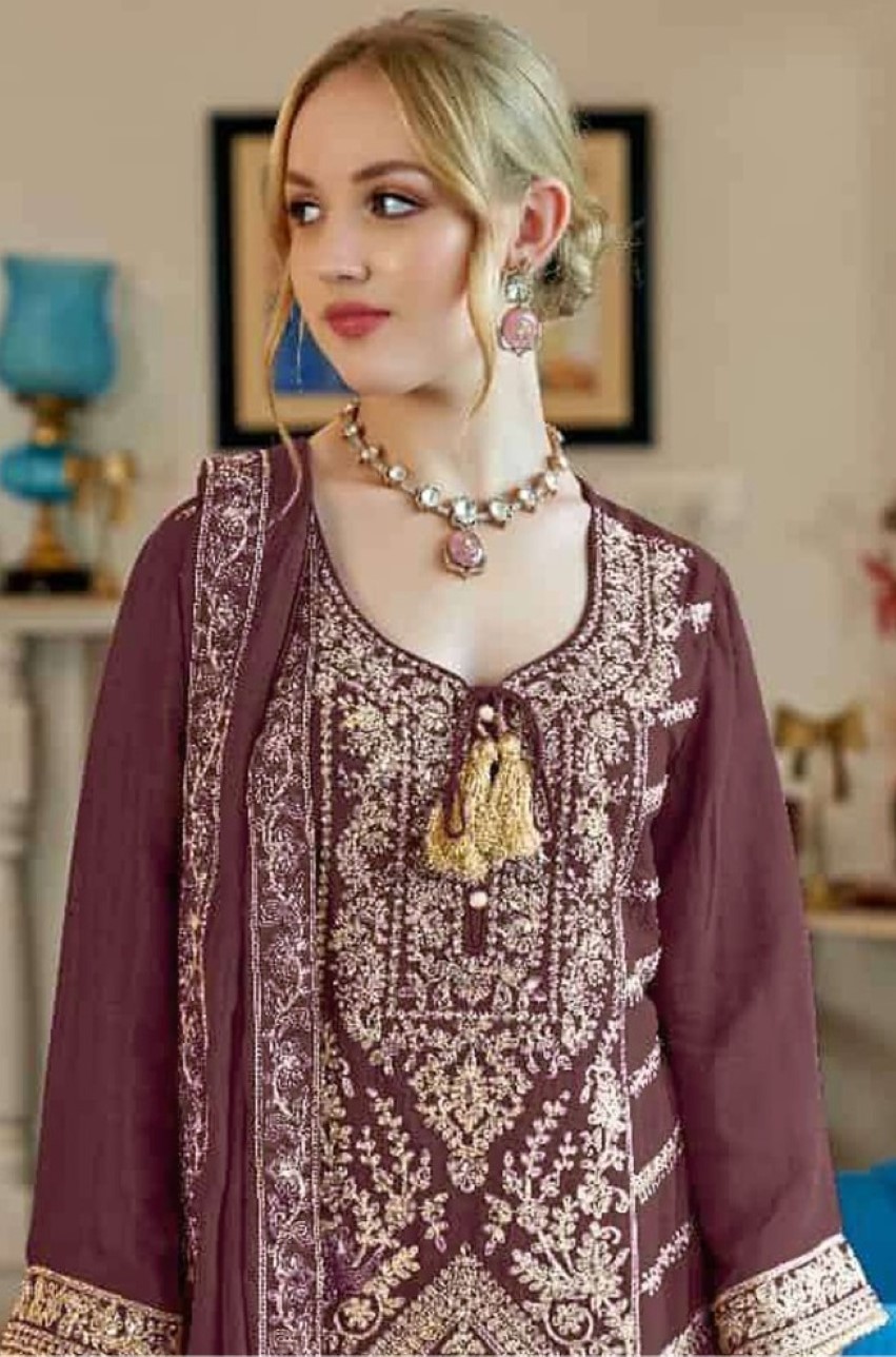 Brown Vichitra Simar With Embroidery Codding Sequence Semi-Stitched Salwar Suit