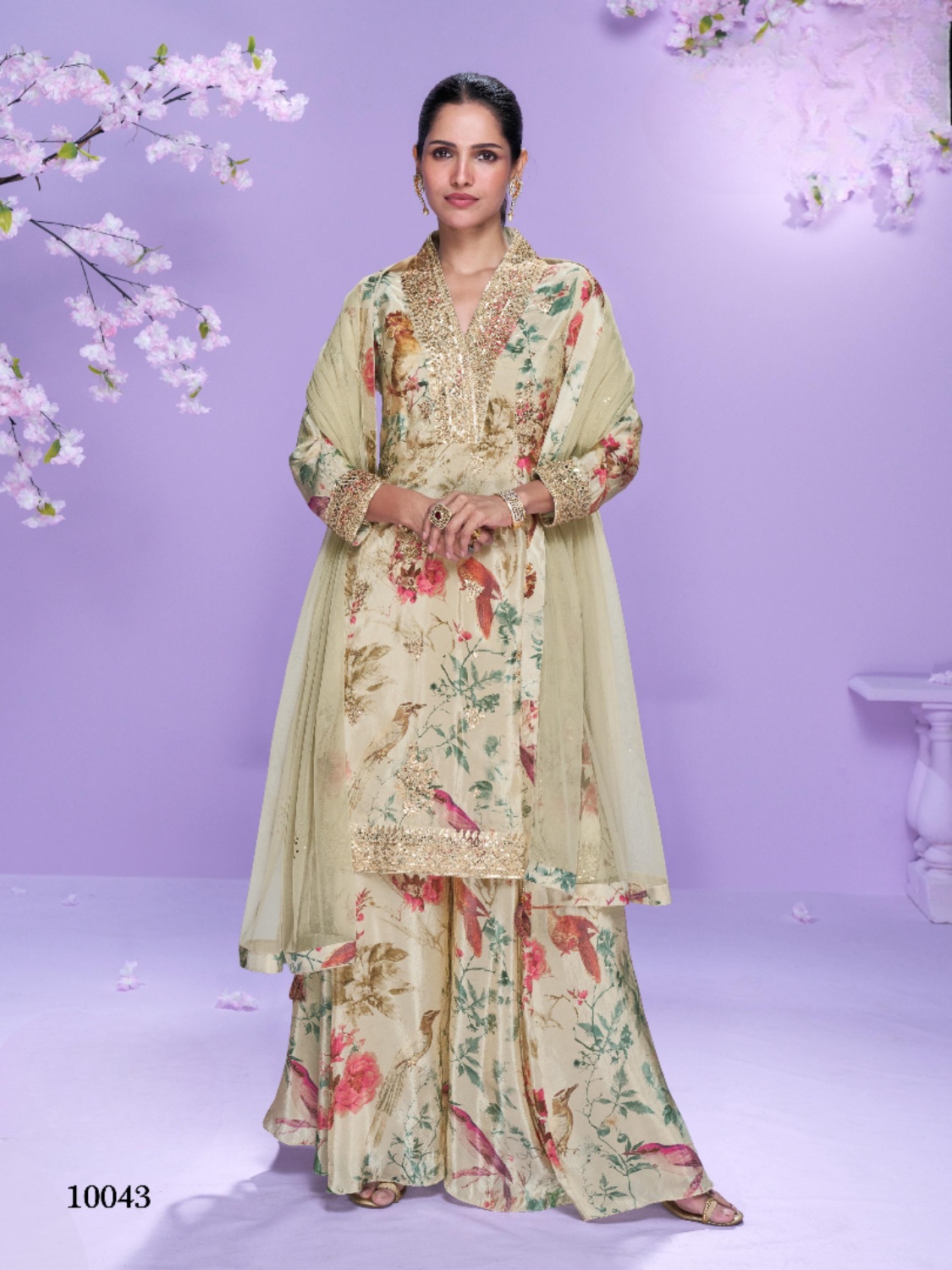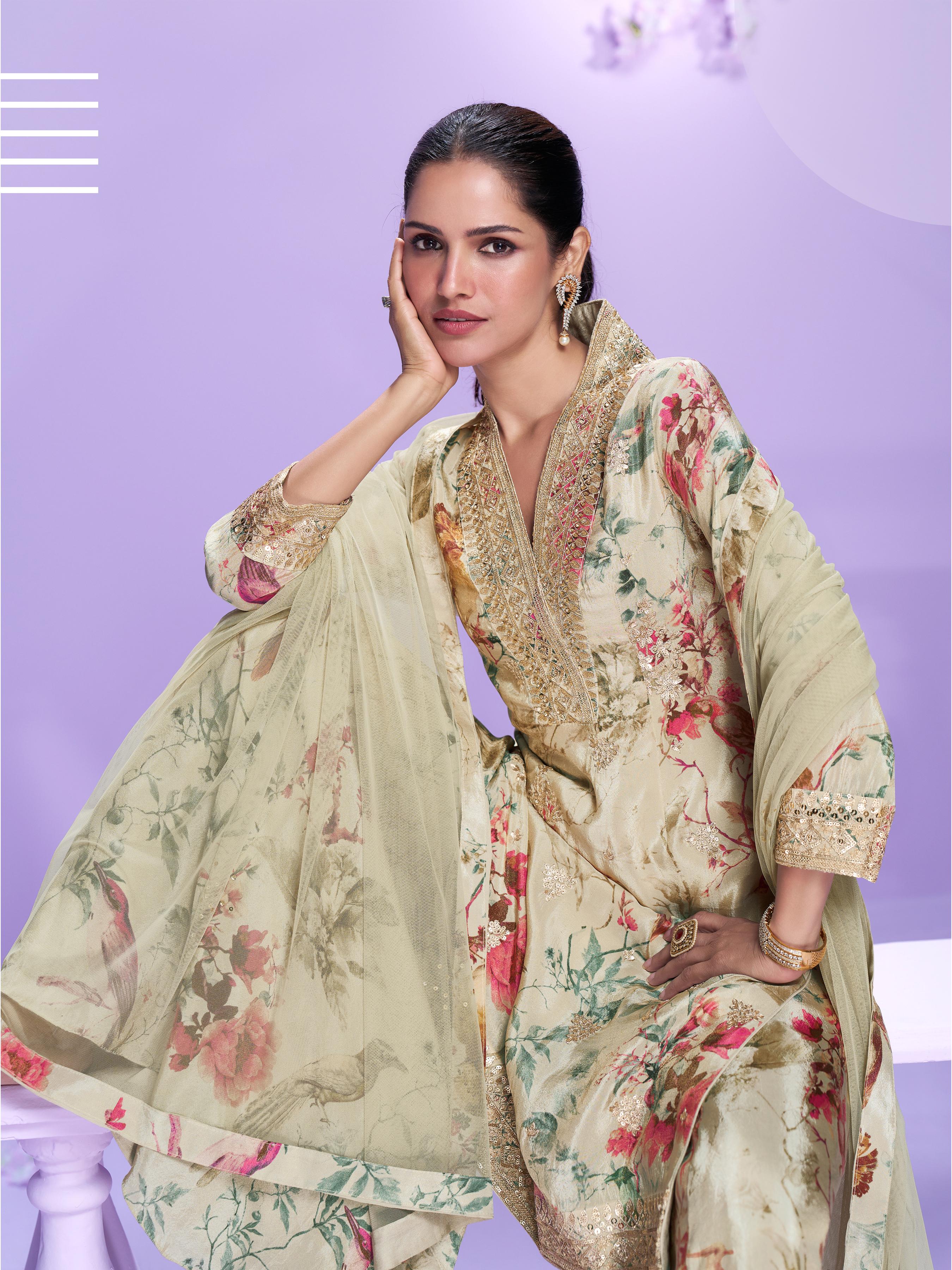 Cream Chinon Readymade Plazzo Suit with Digital Embroidery Work