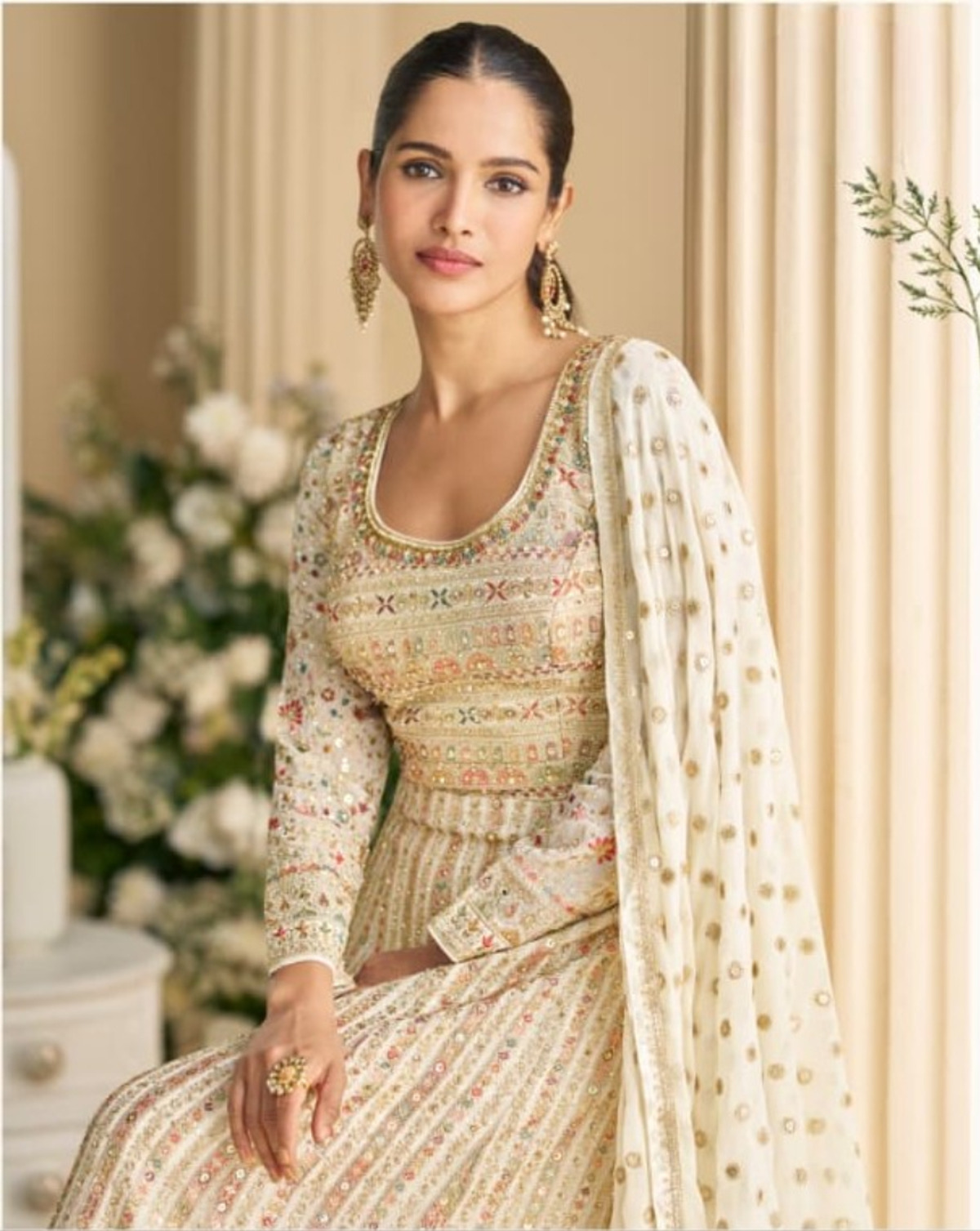 Cream Real Georgette Readymade Anarkali Gown with Embroidery & Sequence Work