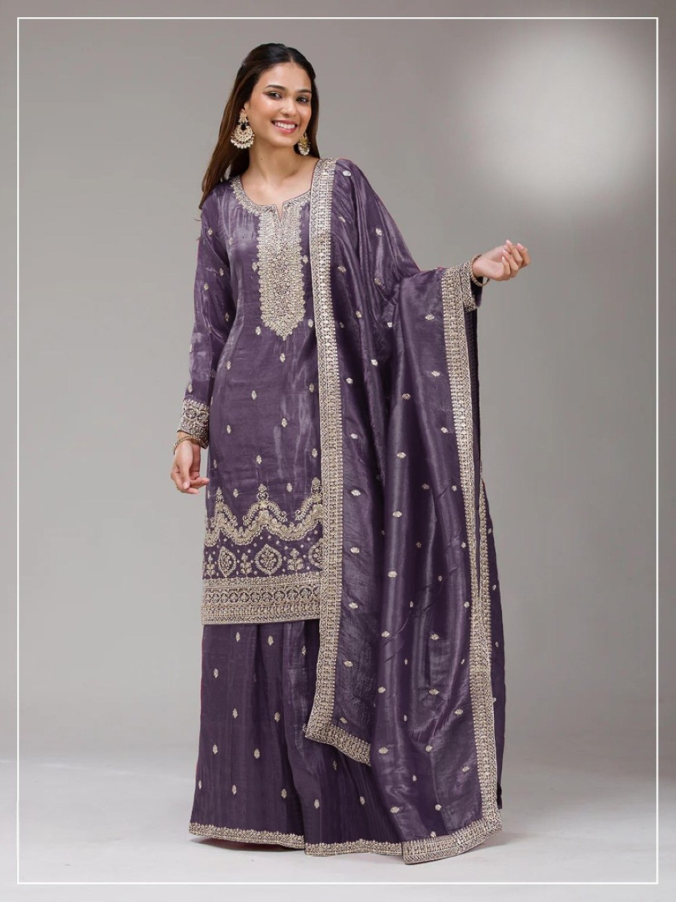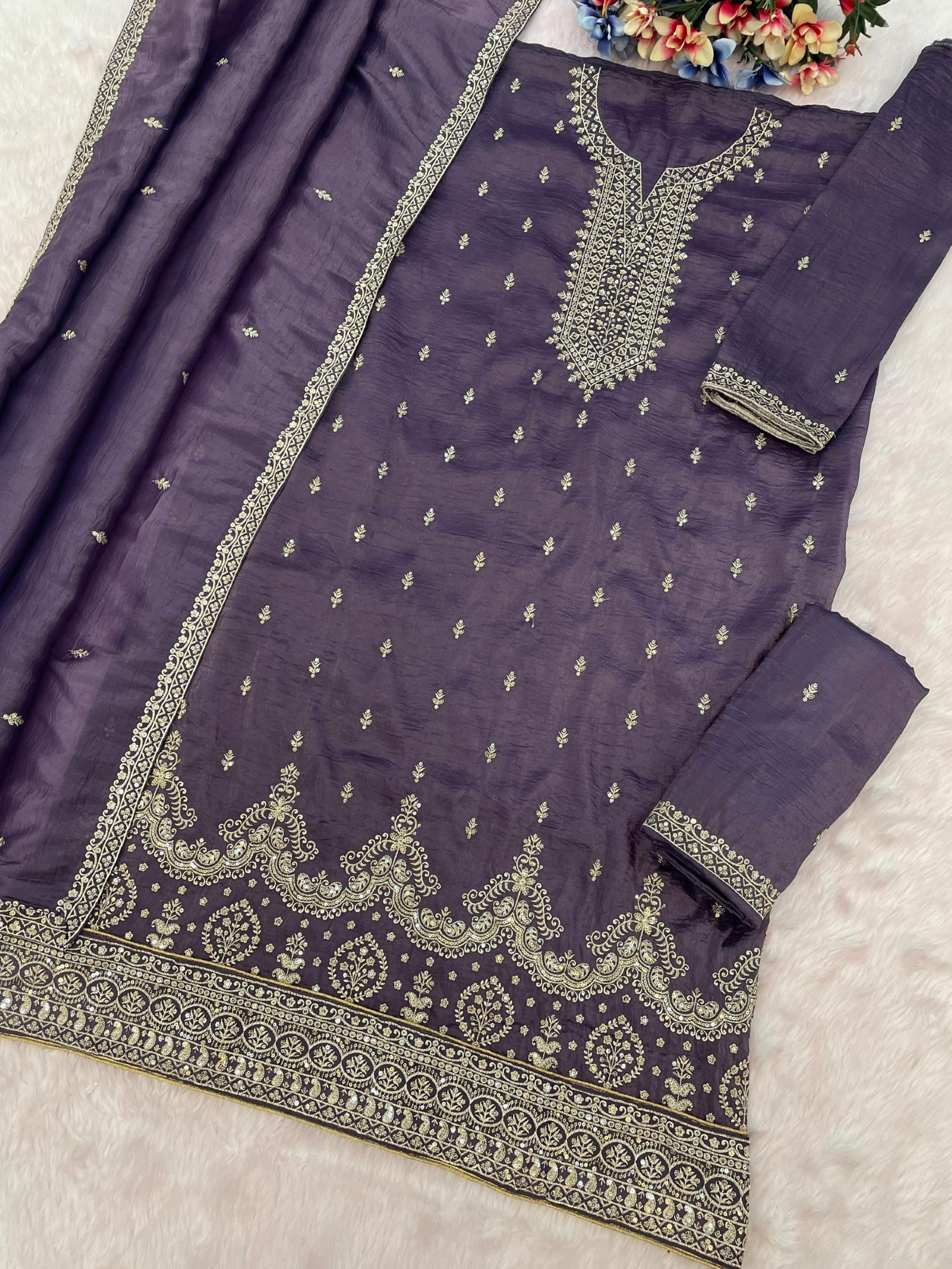 D Lavender Gold Crush Semi Stitched Suit with Embroidery & Sequence Work