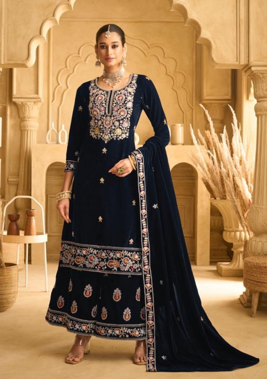Dark Blue Embroderied with Beads Velvet Semi-Stitched Plazo Suit
