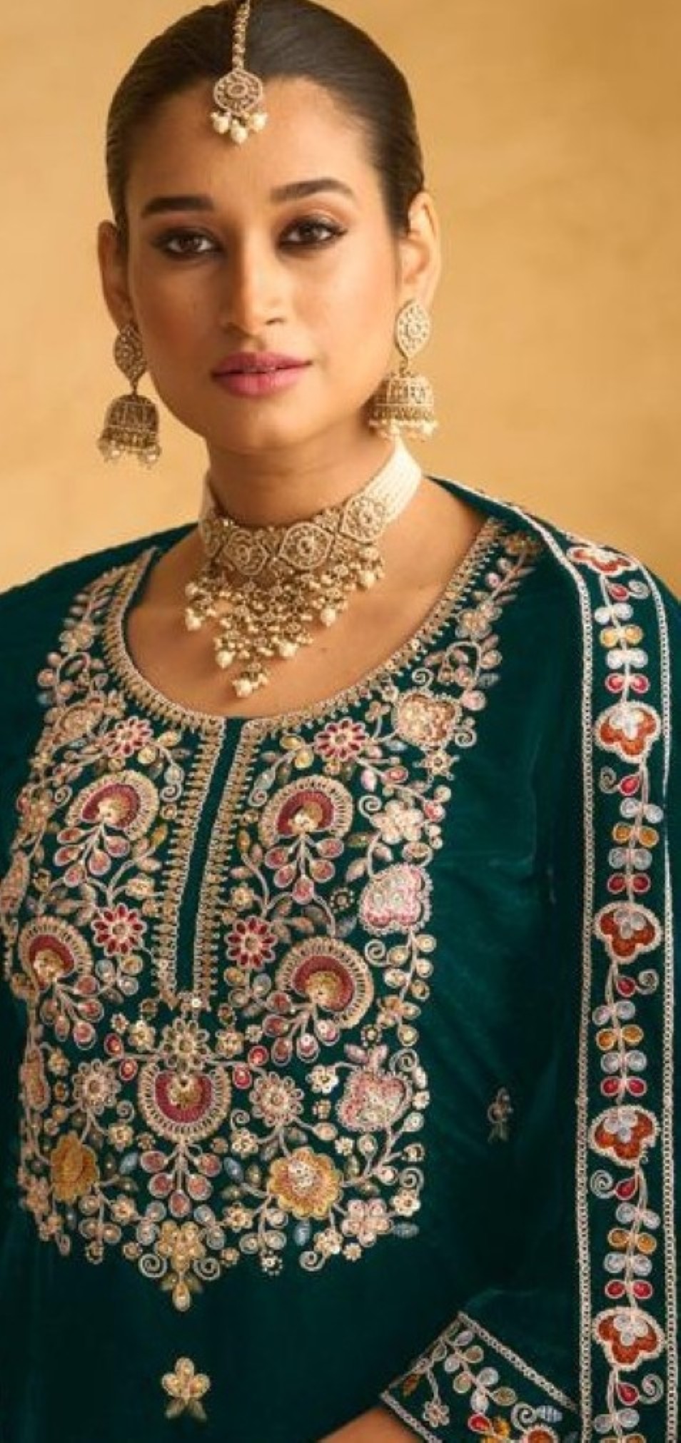 Dark Green Embroderied with Beads Velvet Semi-Stitched Plazo Suit