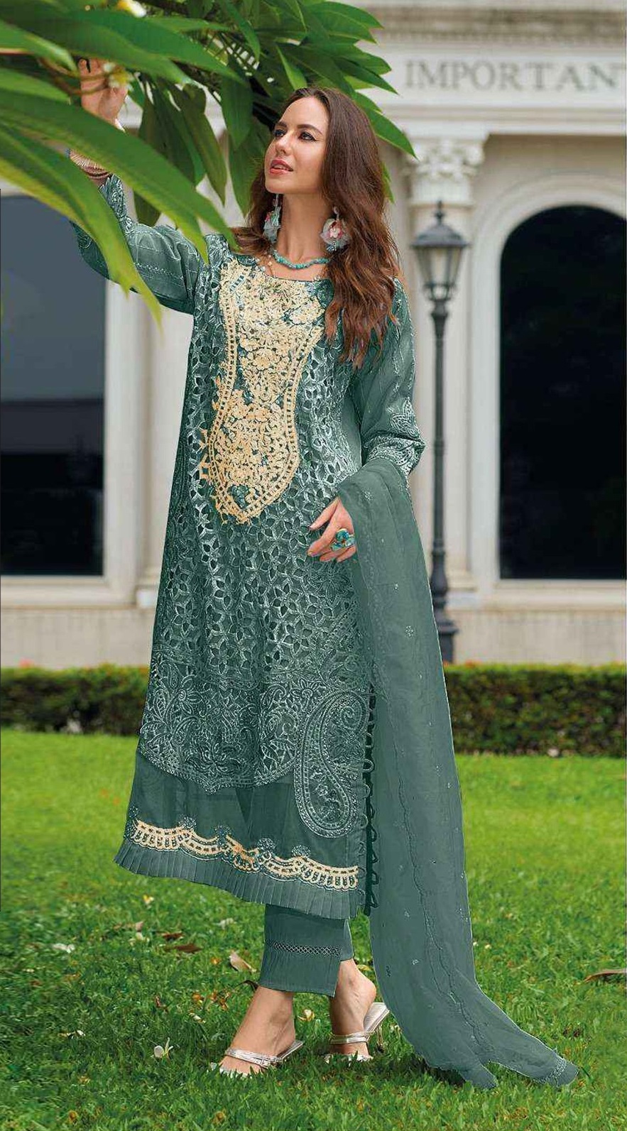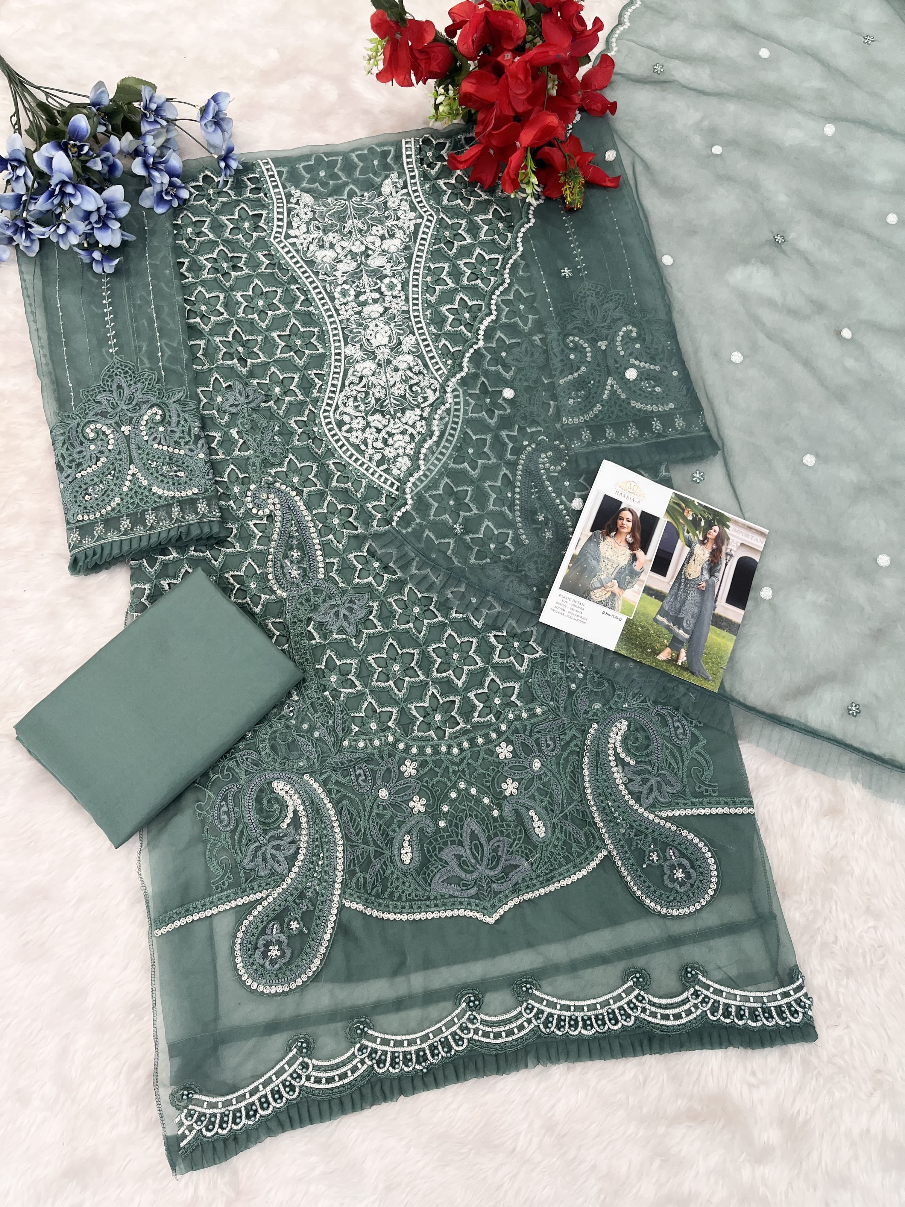 Dark Green embroidered sequence cut work heavy organza unstitched suit with moti & Frill