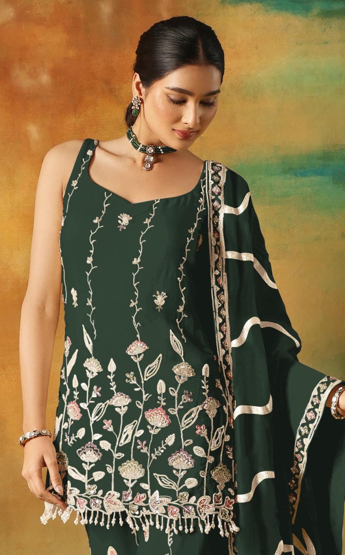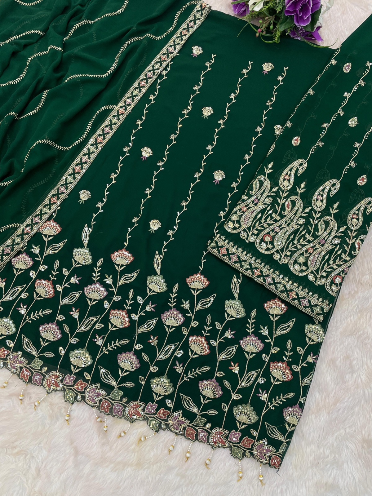 Dark Green Heavy Fox Georgette Semi Stitched Suit With Embroidery Work