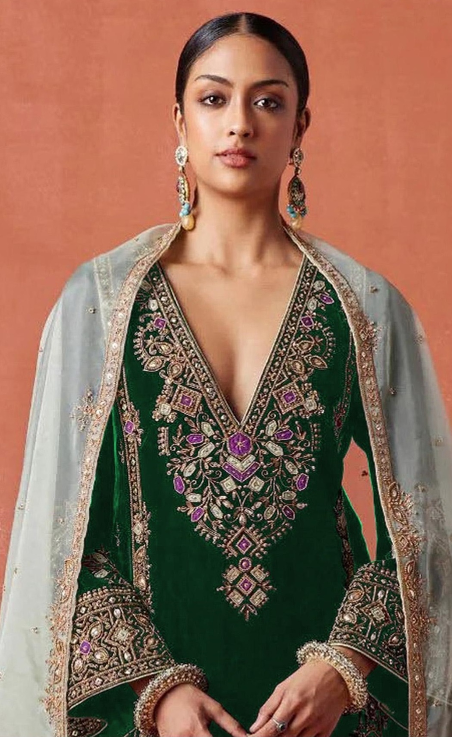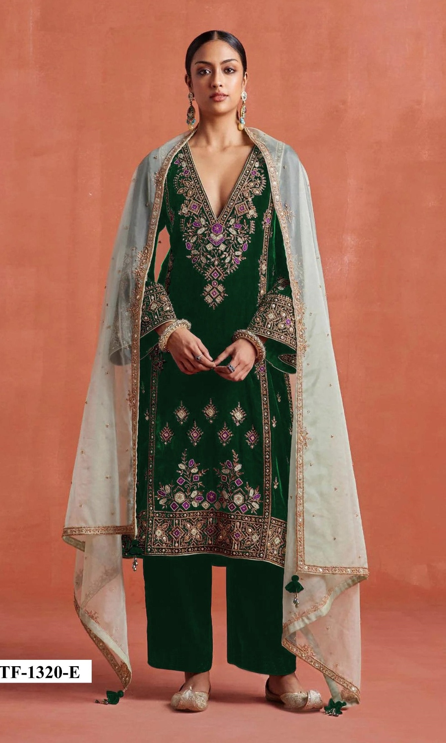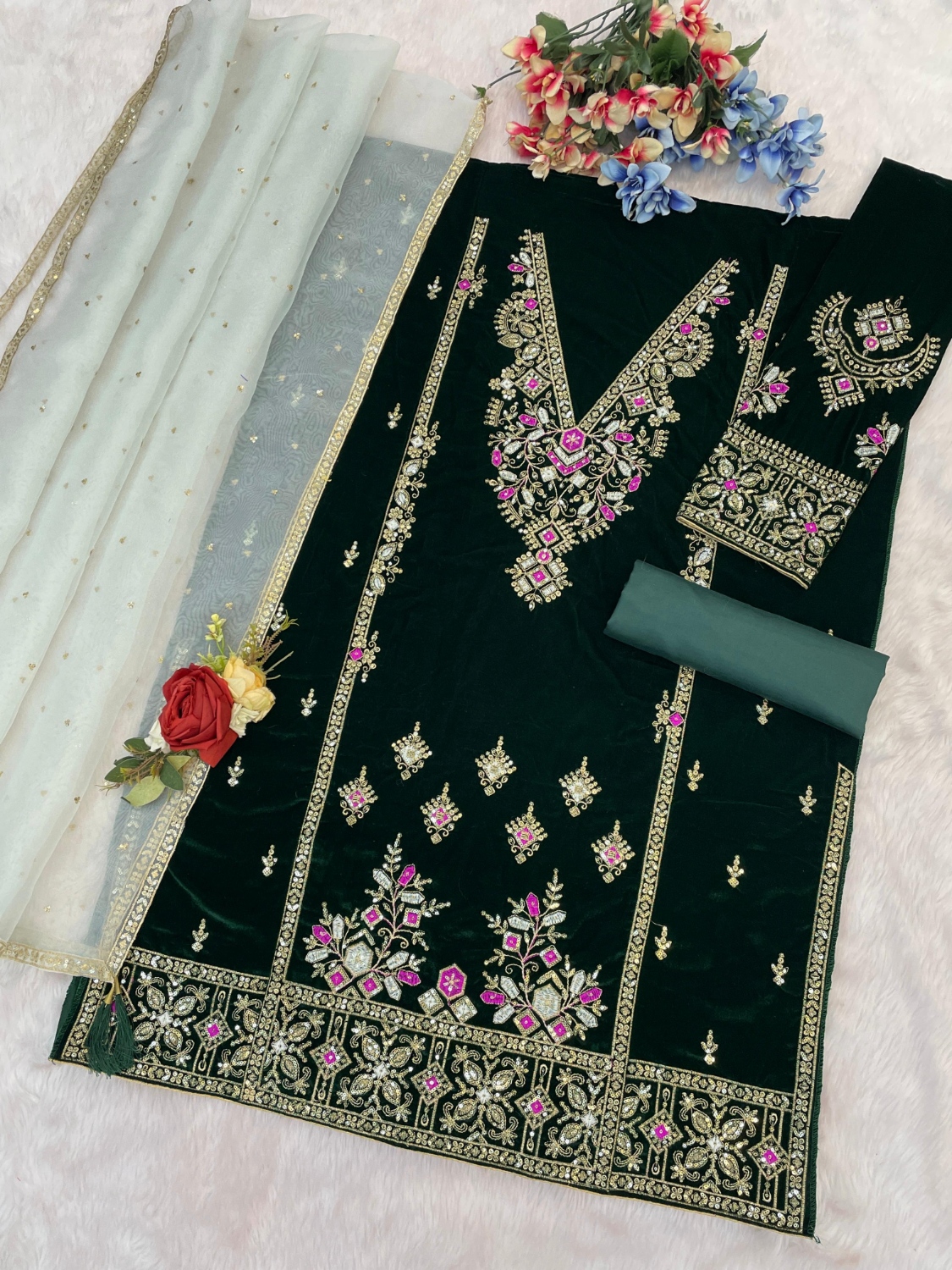 Dark Green Heavy Velvet Semi Stitched Suit With Embroidery Work