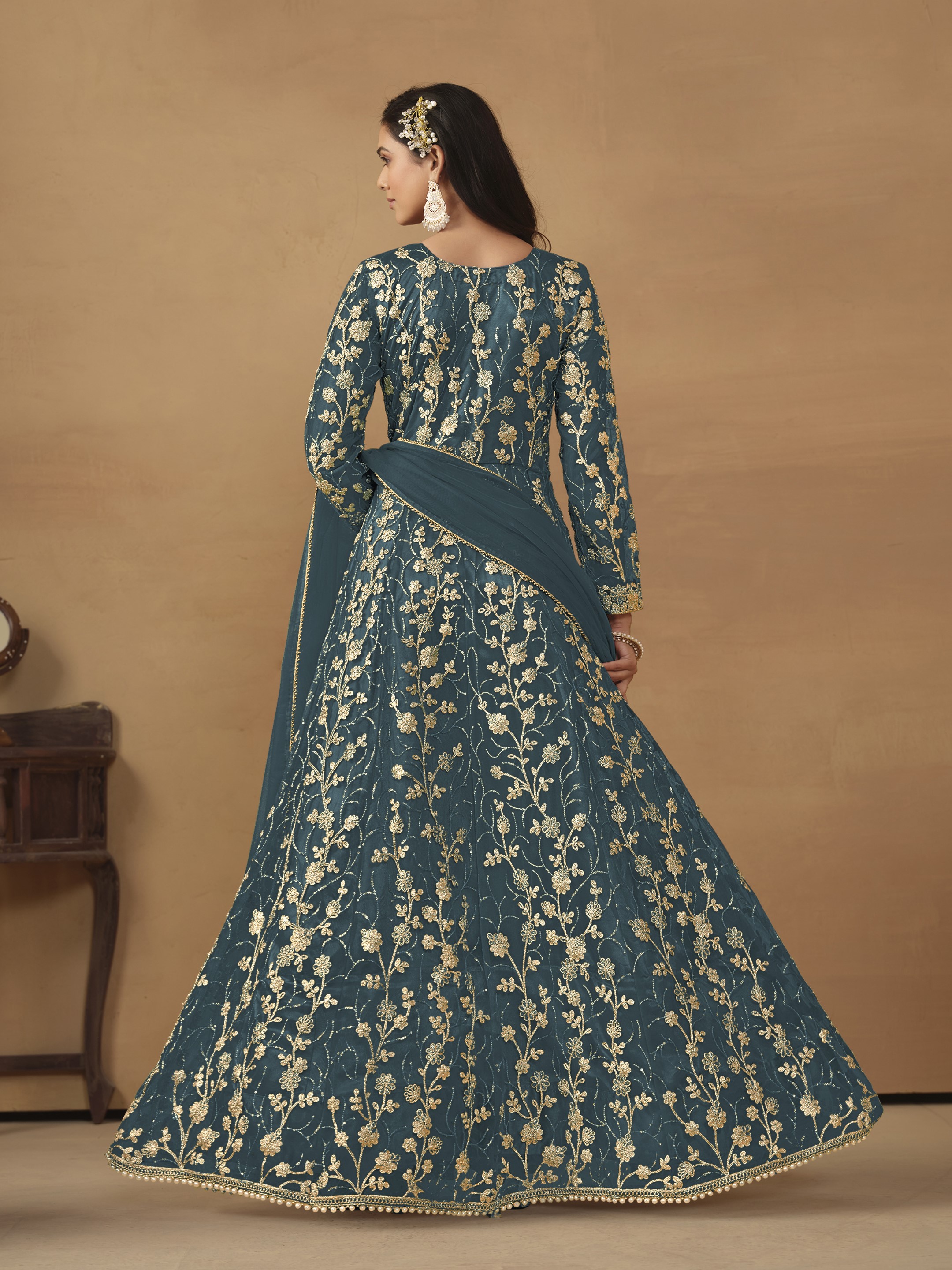 Dark Grey Embroidered Butterfly Net Semi Stitched Anarkali Suit