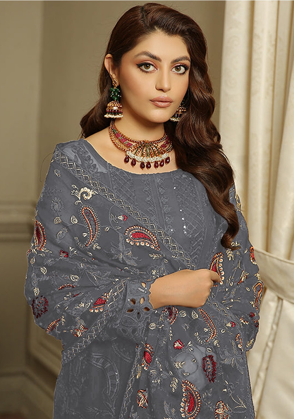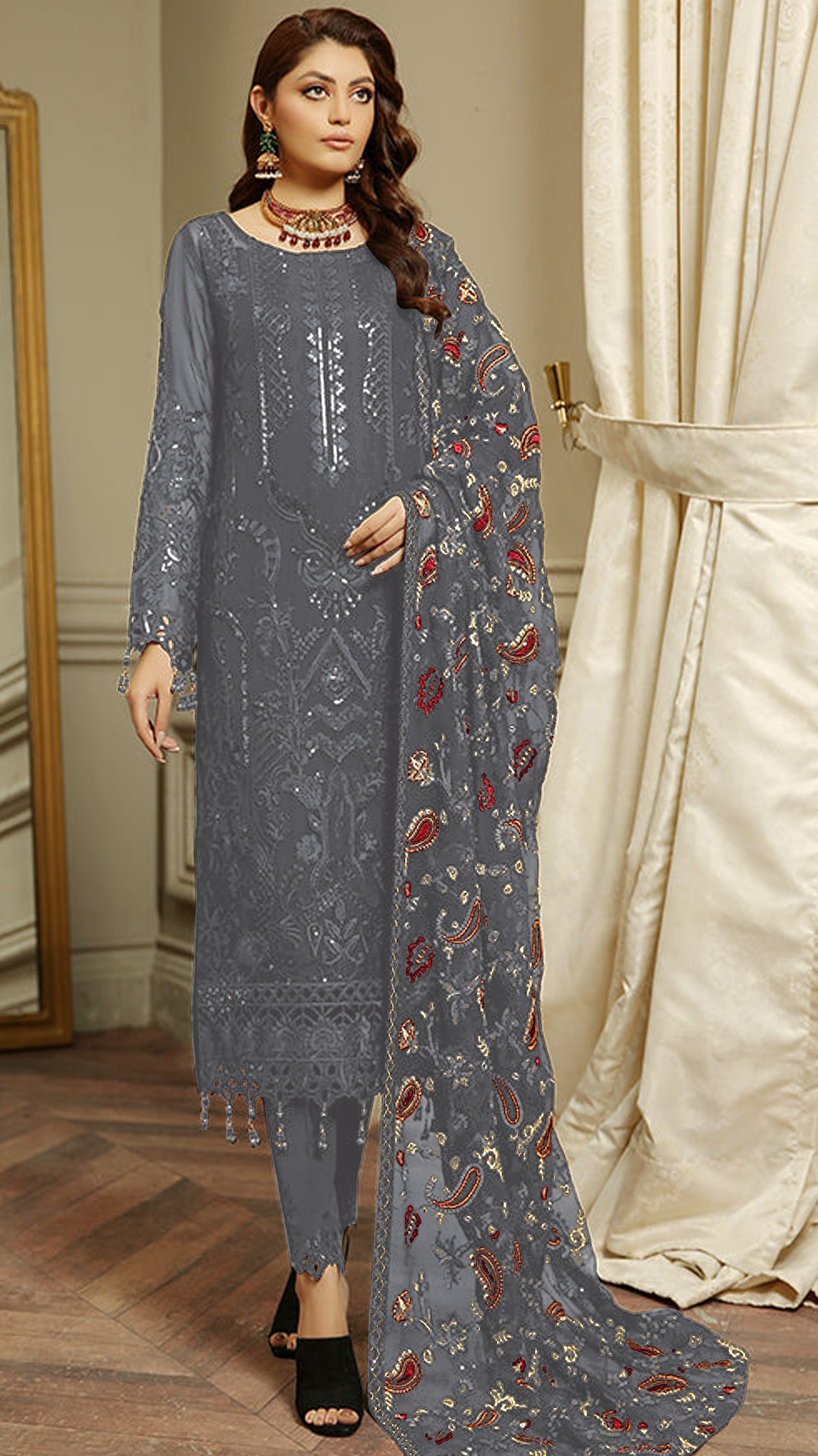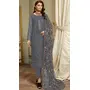 Dark Grey Embroidered Faux Georgette Semi Stitched Salwar Suit