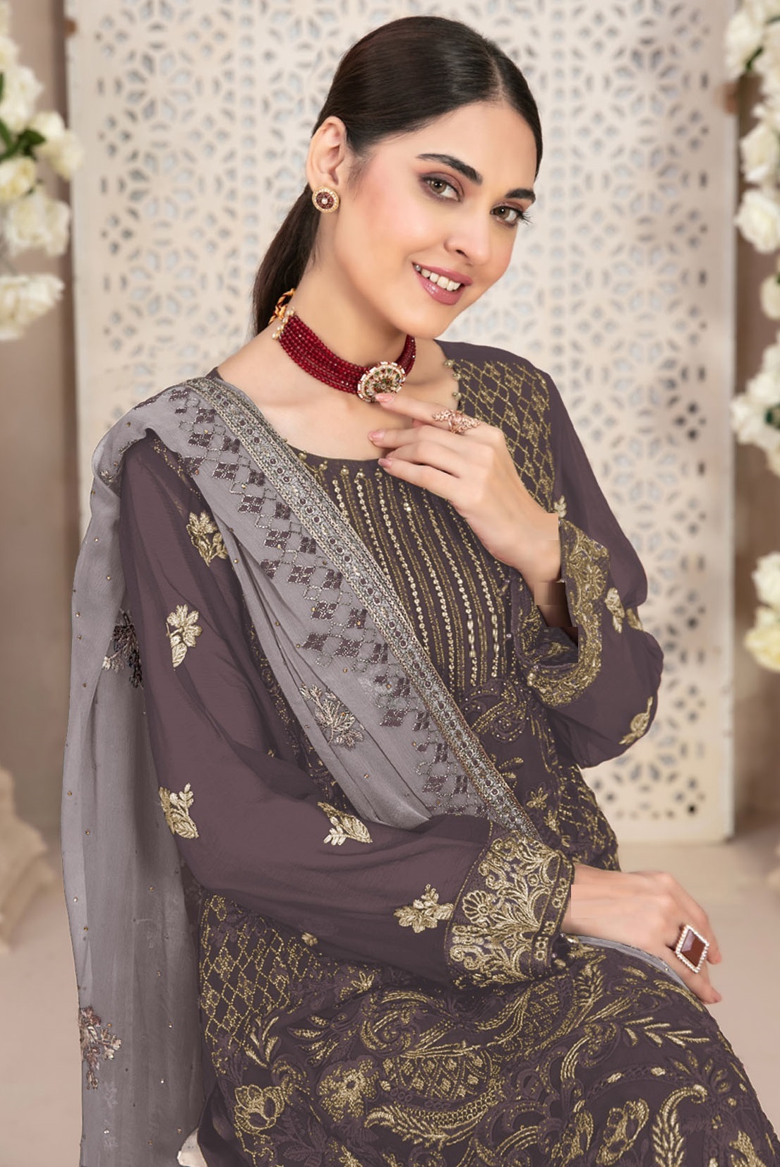 Dark Grey Embroidered Faux Georgette Semi Stitched Salwar Suit