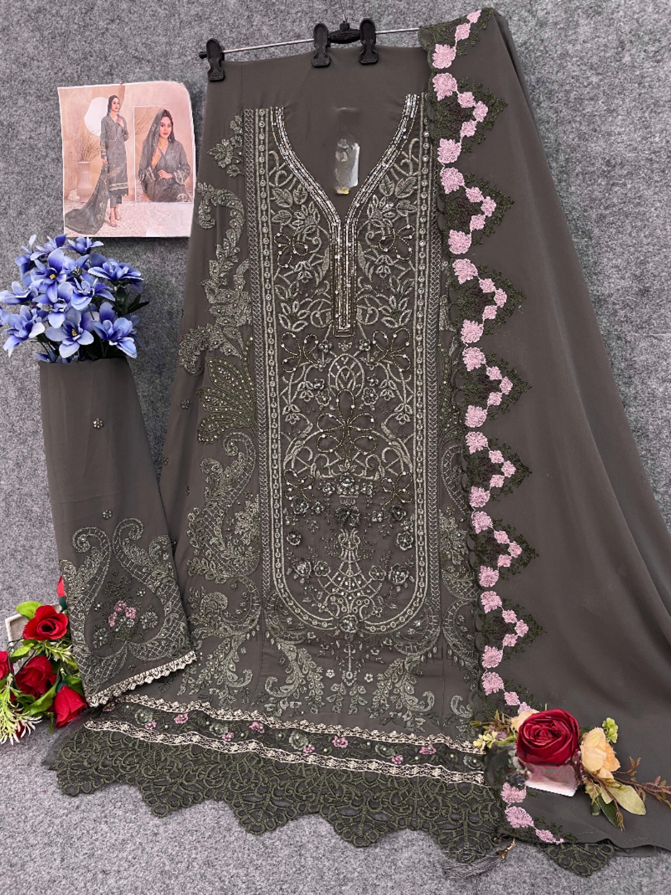 Dark Grey Faux Georgette Semi Stitched Suit with Embroidery Work
