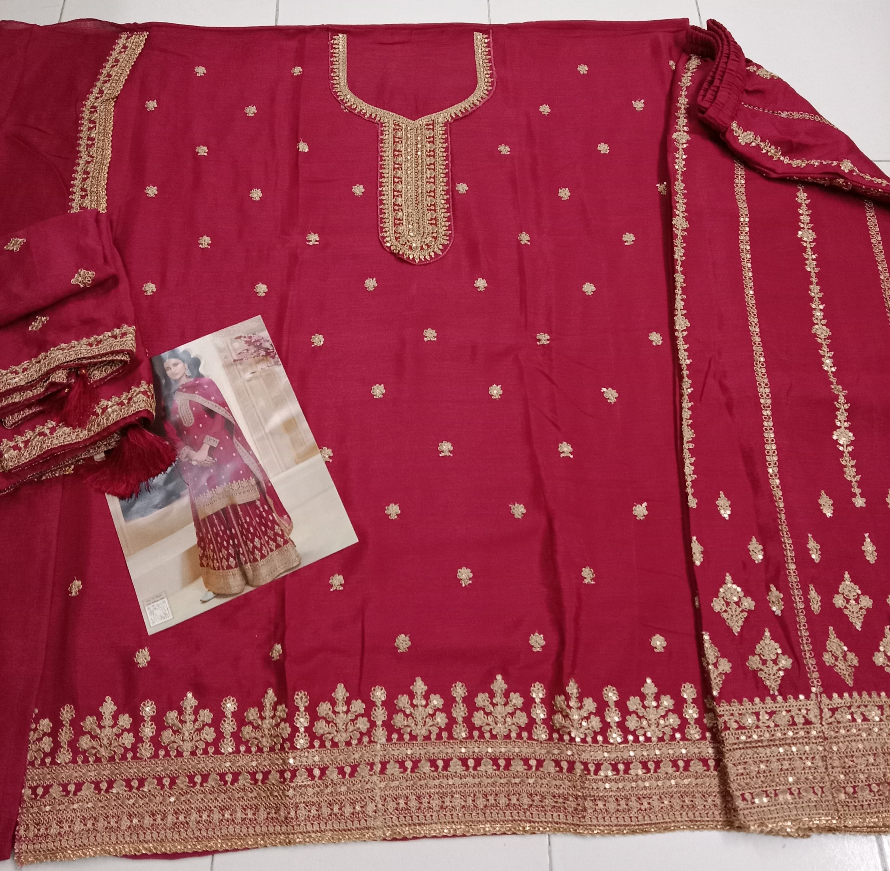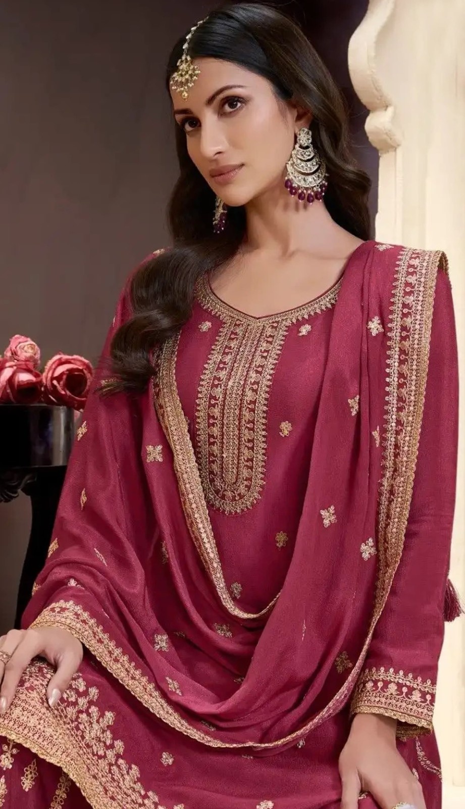 Dark Maroon Chinon Embroidered Semi Stitched Salwar Suit